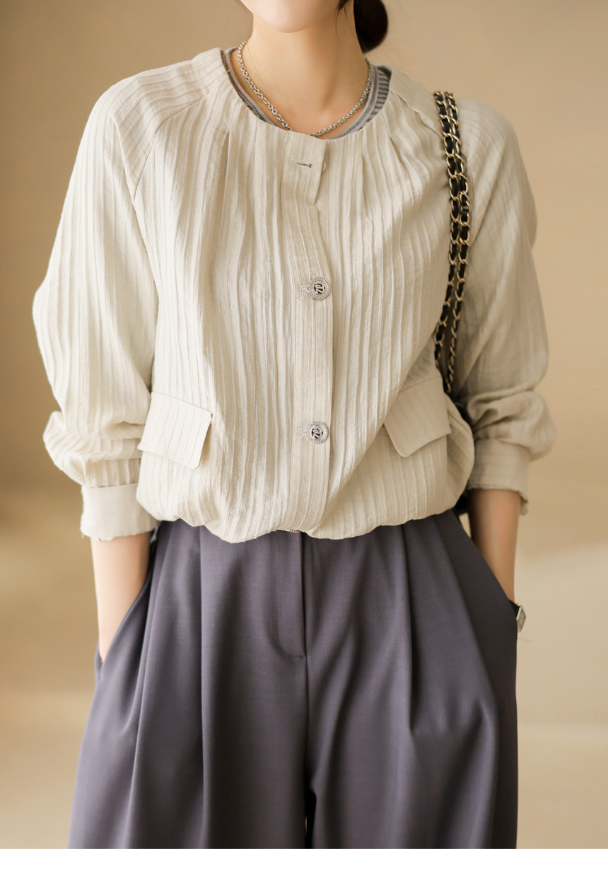 얇은 스트라이프 패턴과 기본 라운드 넥의 긴팔 디자인으로