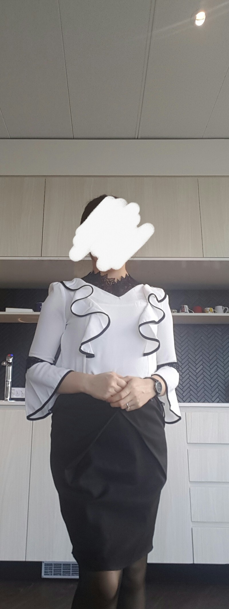 this lace detail black trim line ruffle blouse (what a mouthful! lol) is now one of my favourite. Size M, the v neck line and the lace detail makes this blouse unique and slimming. Because it is white, i was a little worried that I would look a little large in it, but it doesn't make you look fat at all! Wearing it to work. Makes my day~ ![]() ![]() |