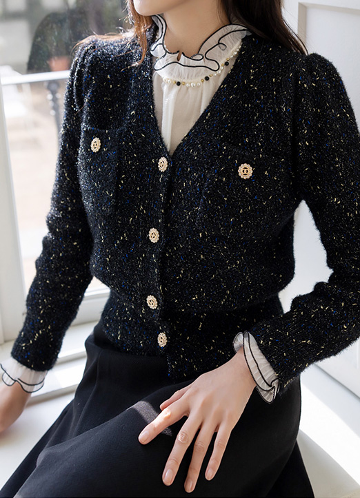Wool30 Jewel Button Puff Sleeve Metallic Knit Cardigan