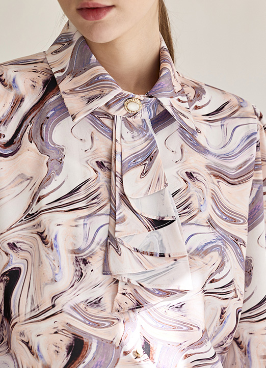 • [The Onme] Marble Print Tie-Neck Collared Blouse
