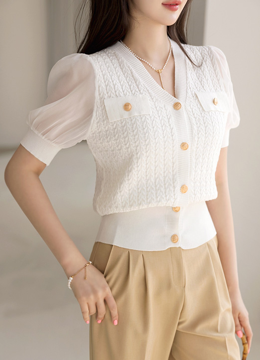 • Ribbed Edge Chiffon Sleeve Cable Knit Cardigan (Short/Long Sleeve)