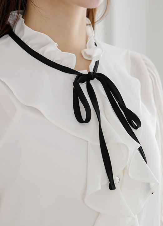 넥라인부터 중앙 부분에 프릴 포인트로 페미닌함이 가득 느껴지며