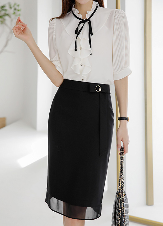 • Soft ruffles cascade along the front with a contrast ribbon tie, while pleated half sleeves add elegance, offering a lightweight, polished summer look.