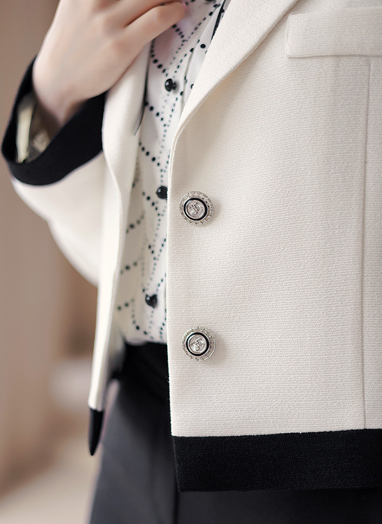 • A white tailored jacket with bold black trim and statement buttons, offering a chic and versatile semi-cropped fit.