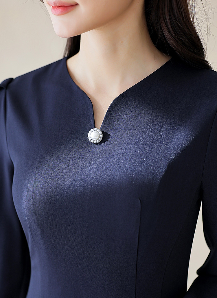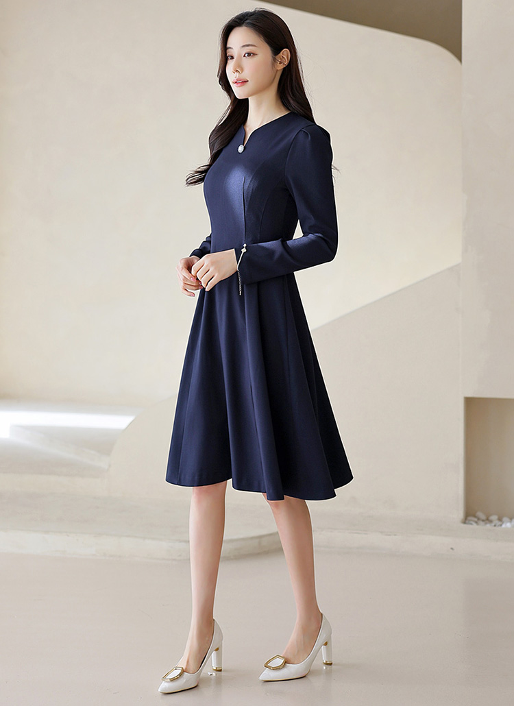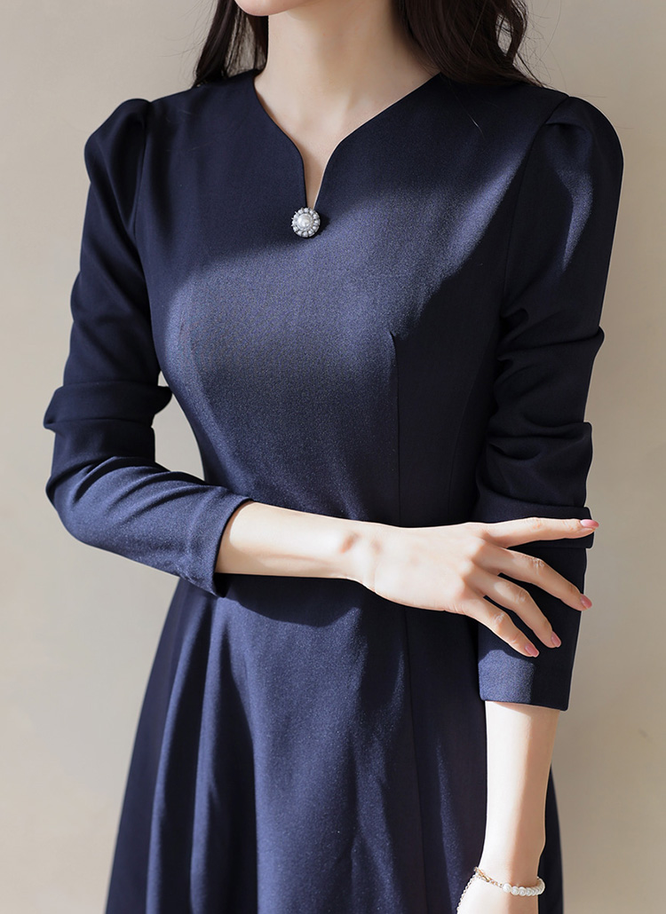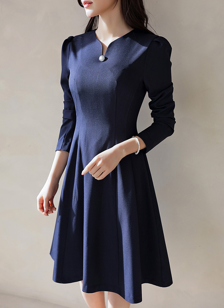 • V-Neck Pearl Point Elegant Slime Flare Dress