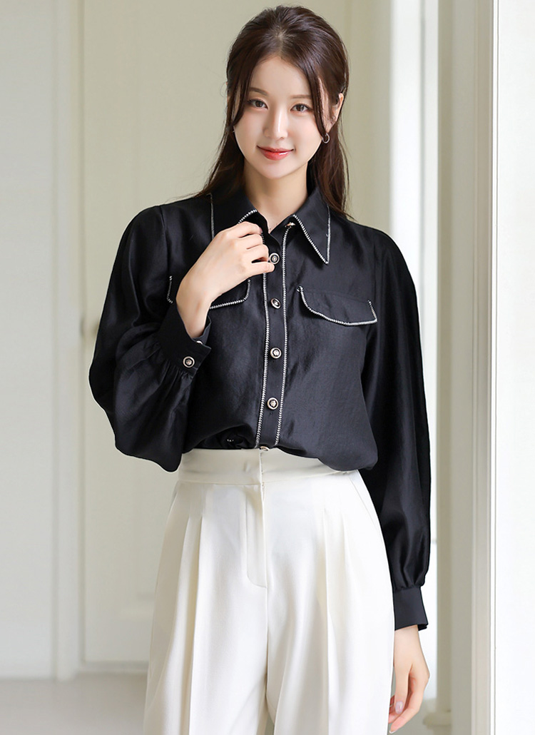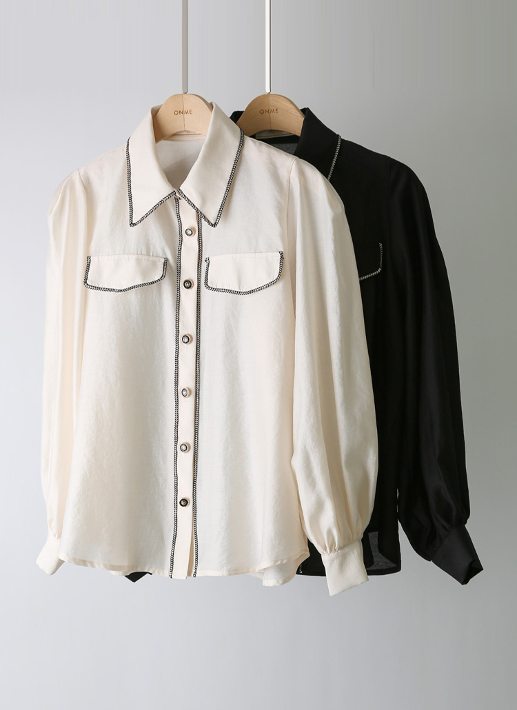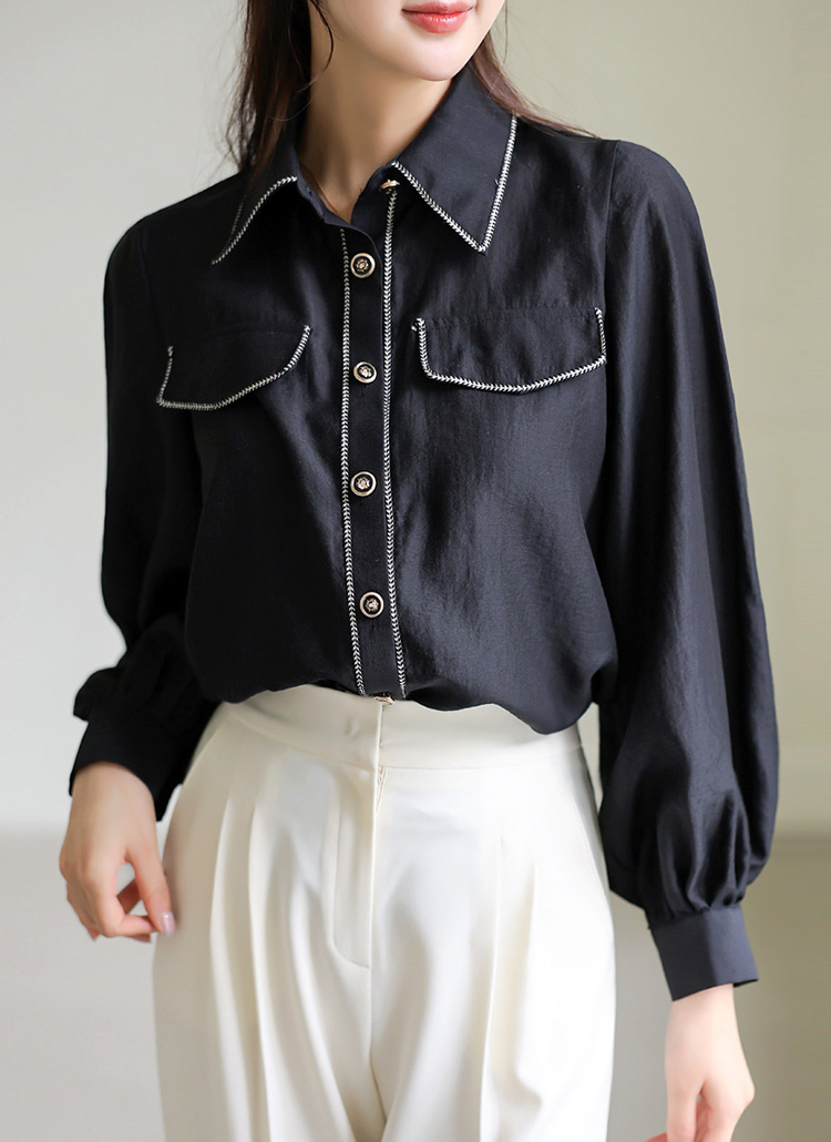 브레이드 라인 디테일이 돋보이는 모달 새틴 블라우스로