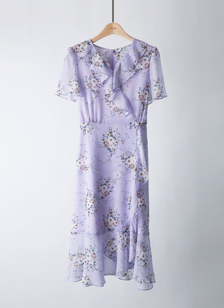 • Flowy chiffon and a soft lilac floral print create a romantic wrap dress with a waist tie and dreamy ruffle details.