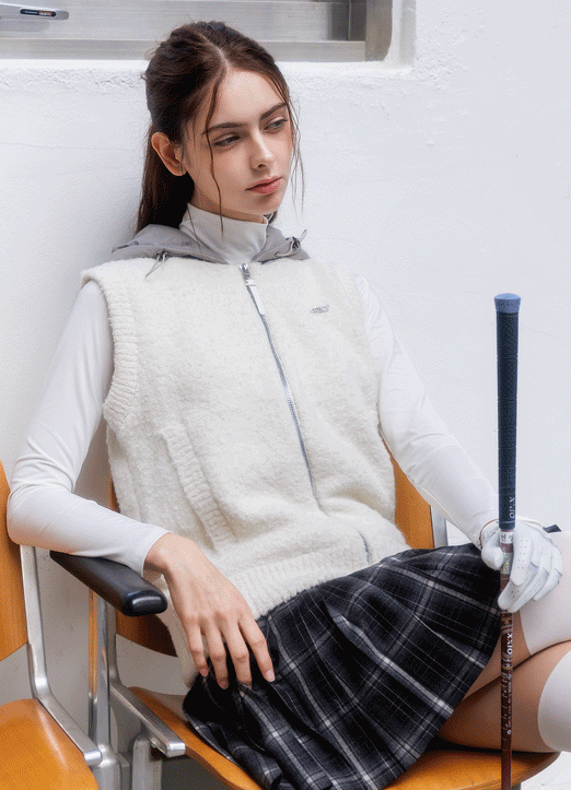 • A modern striped knit vest with subtle tape detail at the hem, offering chic layering and flexibility for sporty or casual looks.