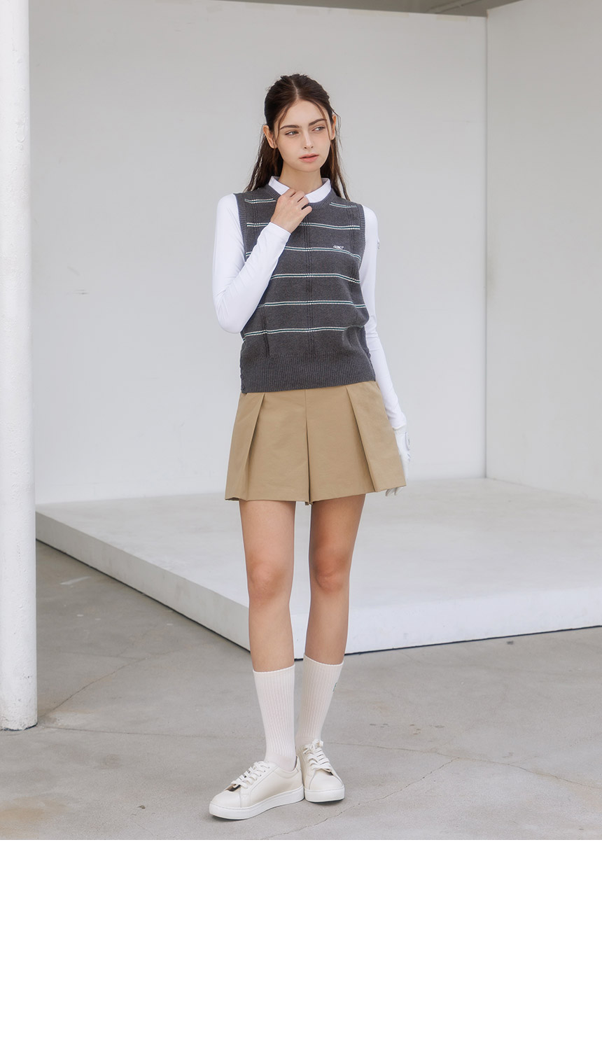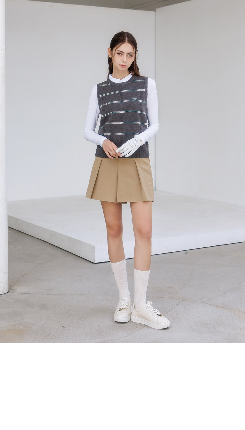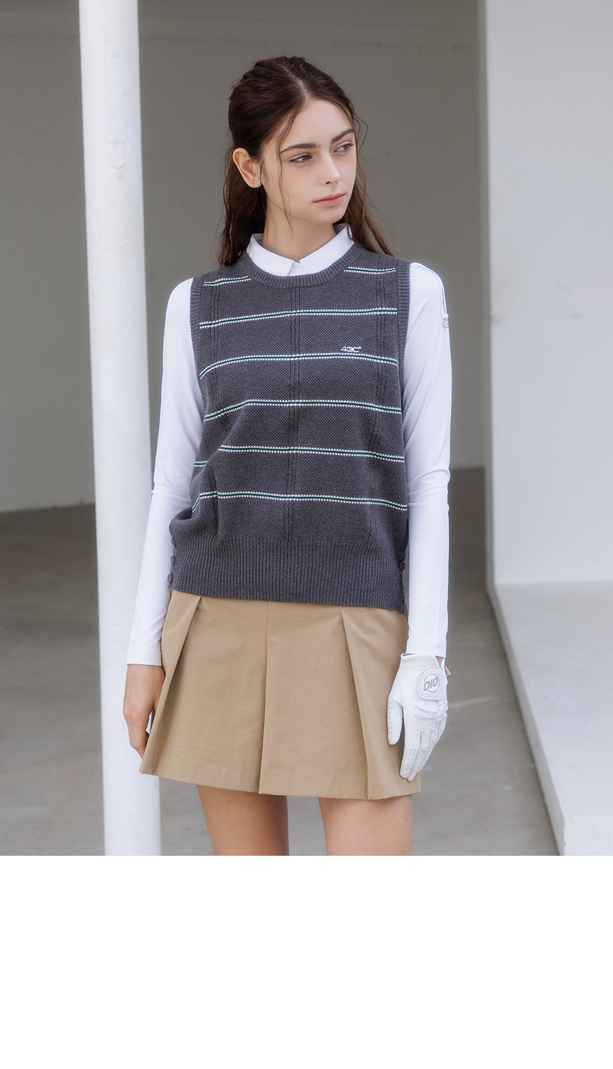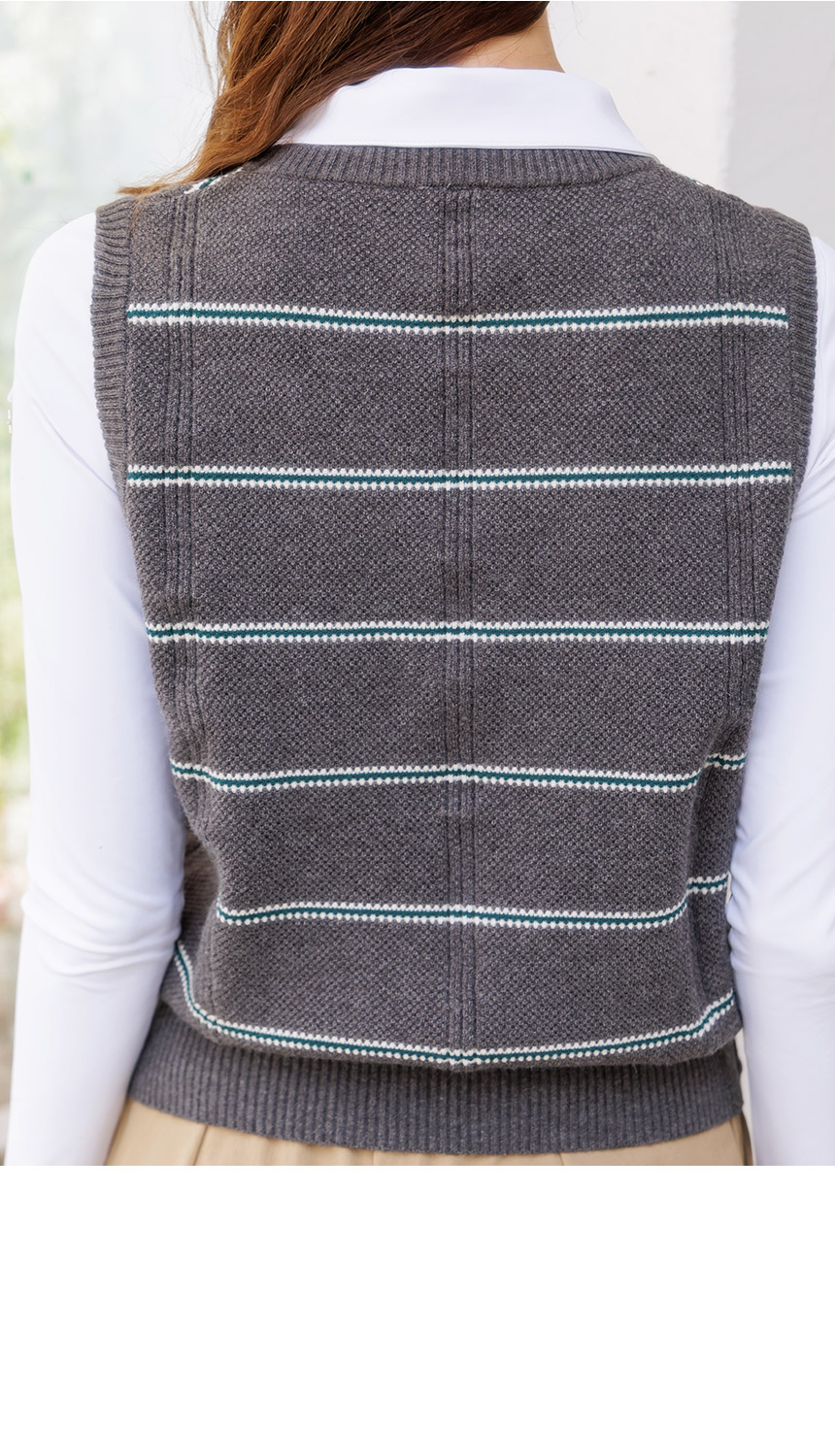 • A modern striped knit vest with subtle tape detail at the hem, offering chic layering and flexibility for sporty or casual looks.