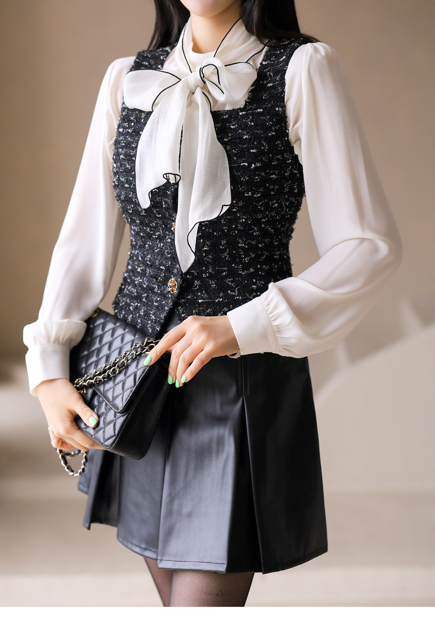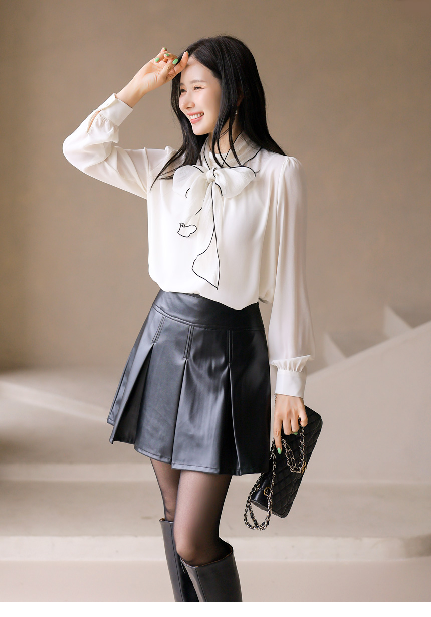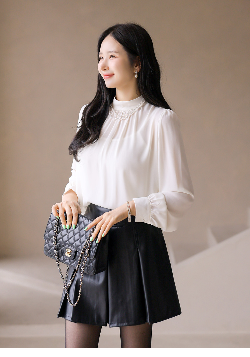 • Chic mock-neck blouse with delicate pleats and a lightweight chiffon scarf trimmed in subtle contrast. Creates an elegant, modern silhouette.