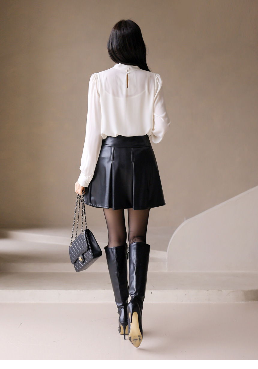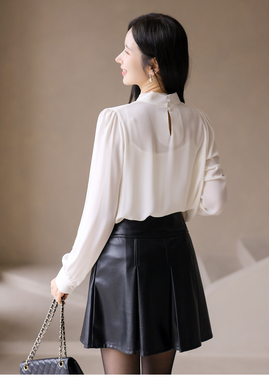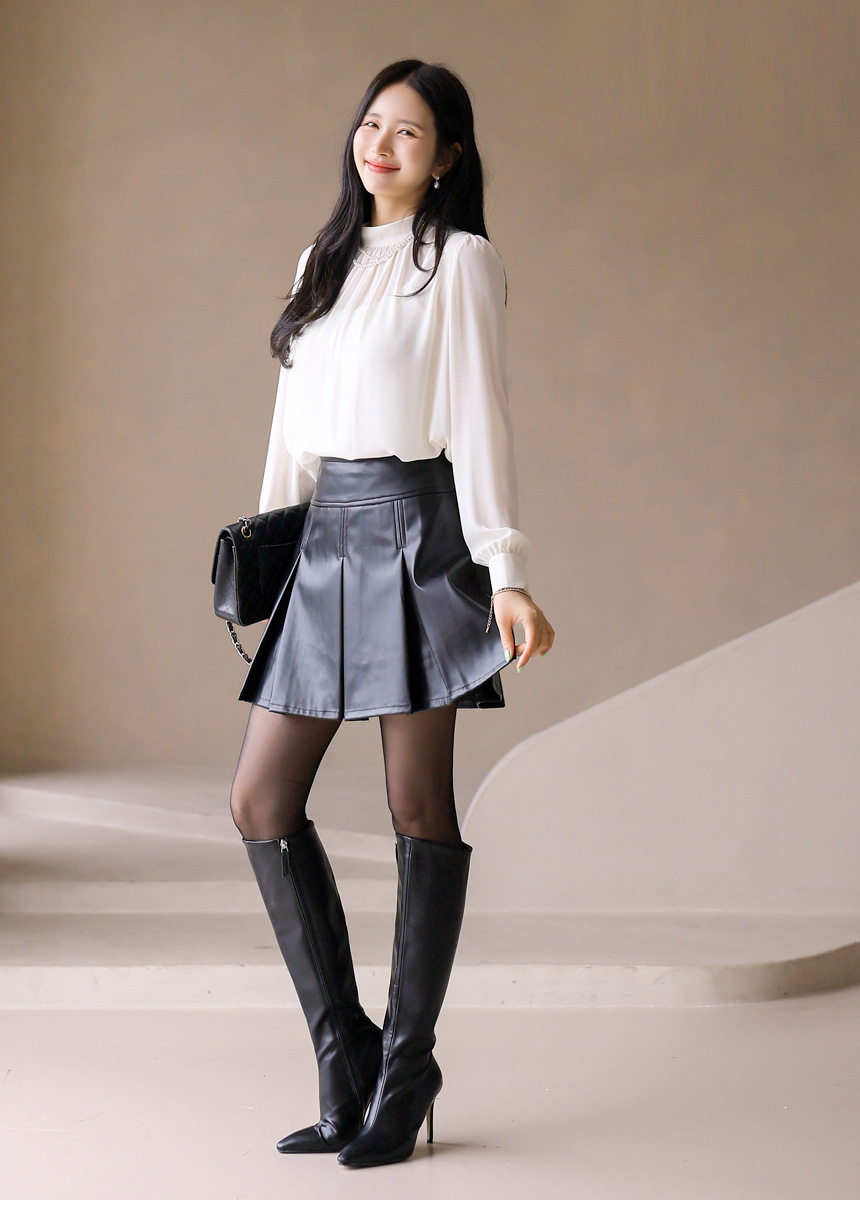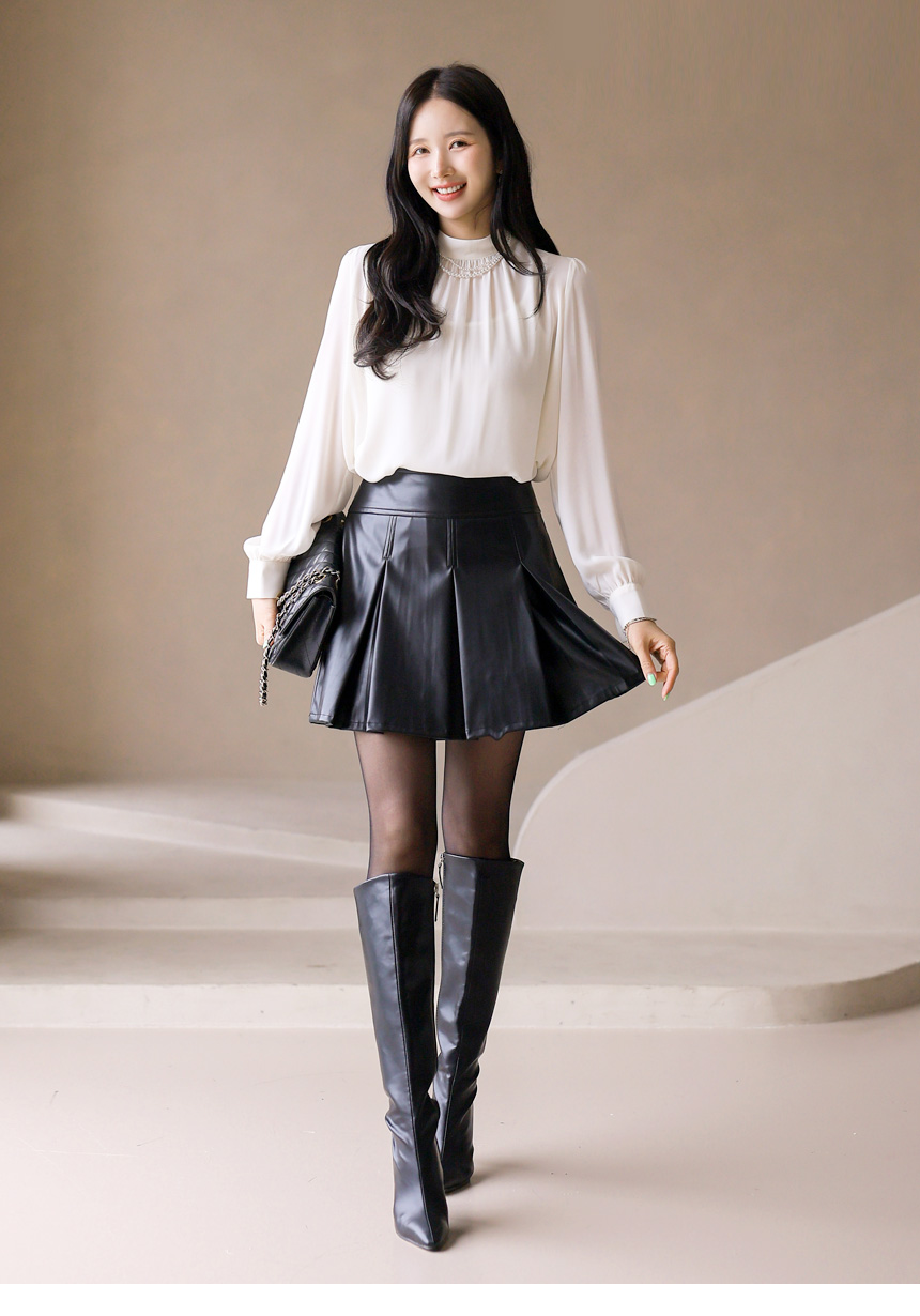 • Chic mock-neck blouse with delicate pleats and a lightweight chiffon scarf trimmed in subtle contrast. Creates an elegant, modern silhouette.