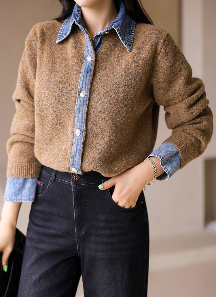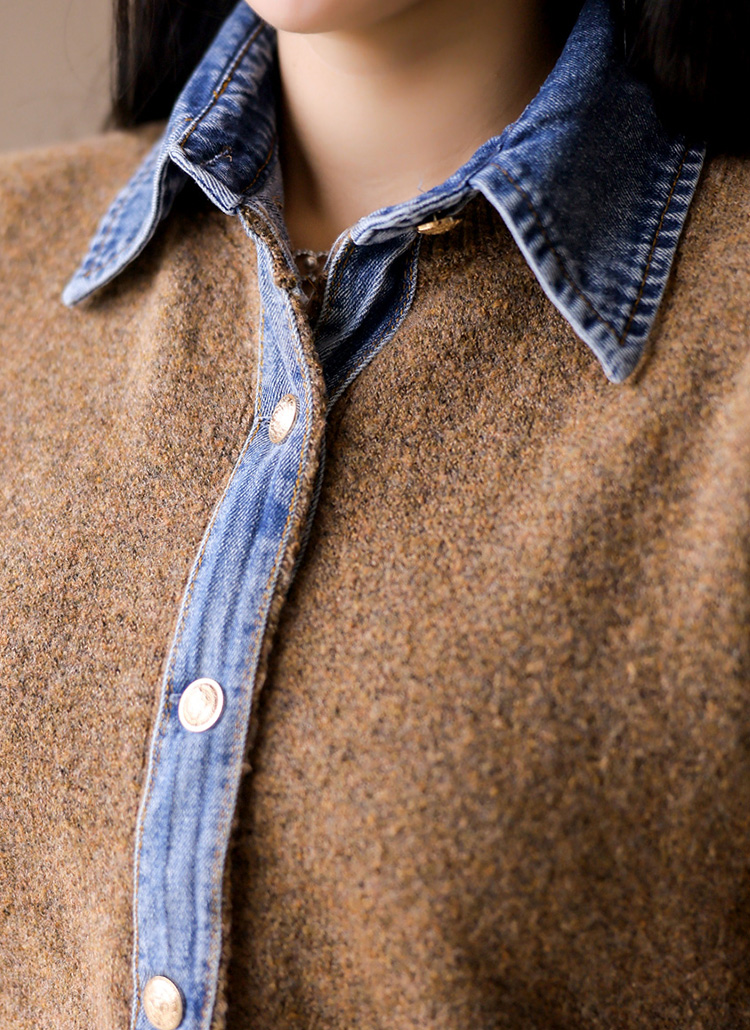 • This knit cardigan combines soft bouclé texture with denim accents for a chic layered vibe—perfect for casual fall and winter styling.