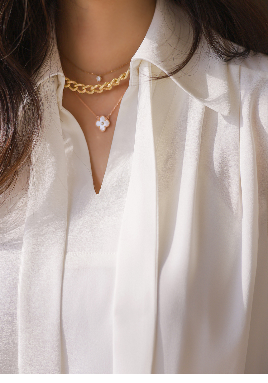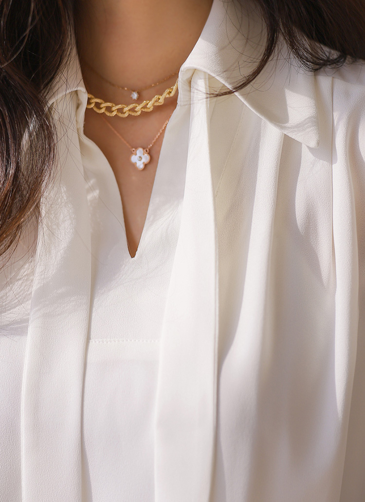 • A fluid silky blouse with removable chain and tie accents, featuring soft shoulder gathers that create an elegant drape and polished feminine silhouette.