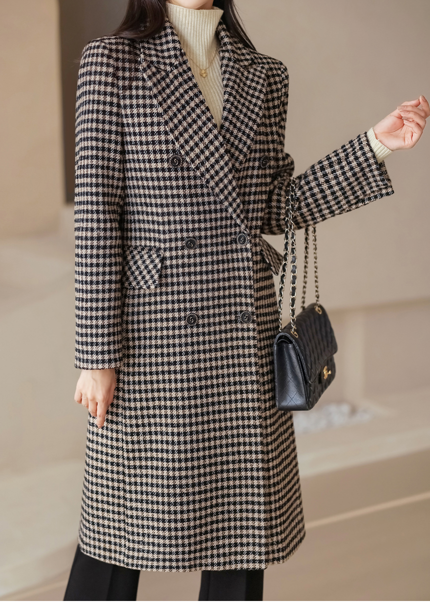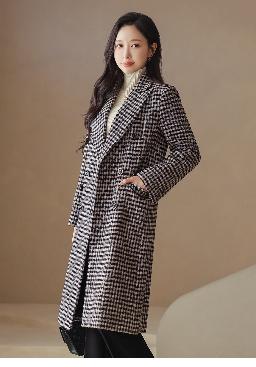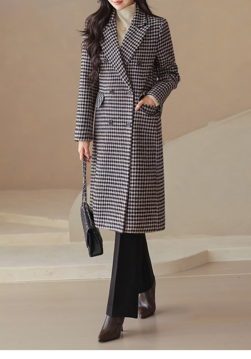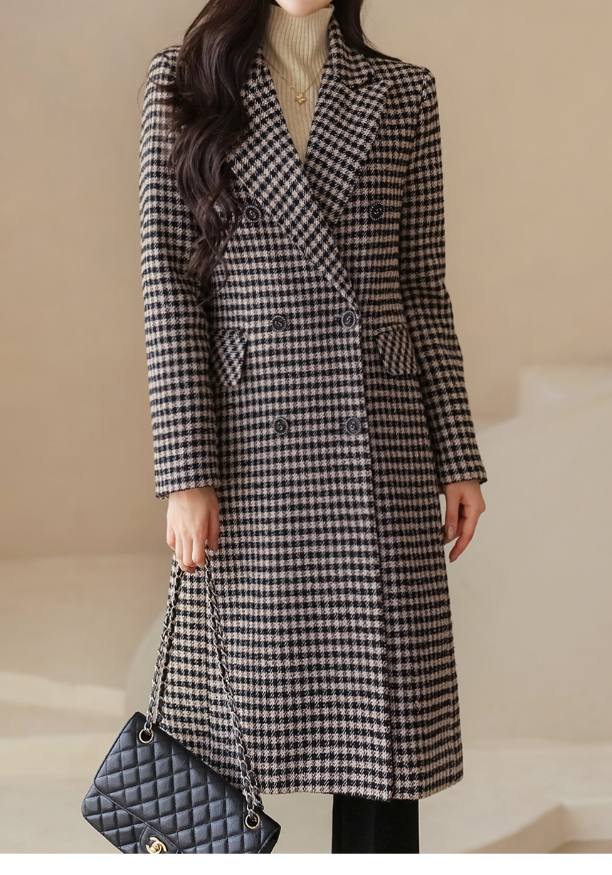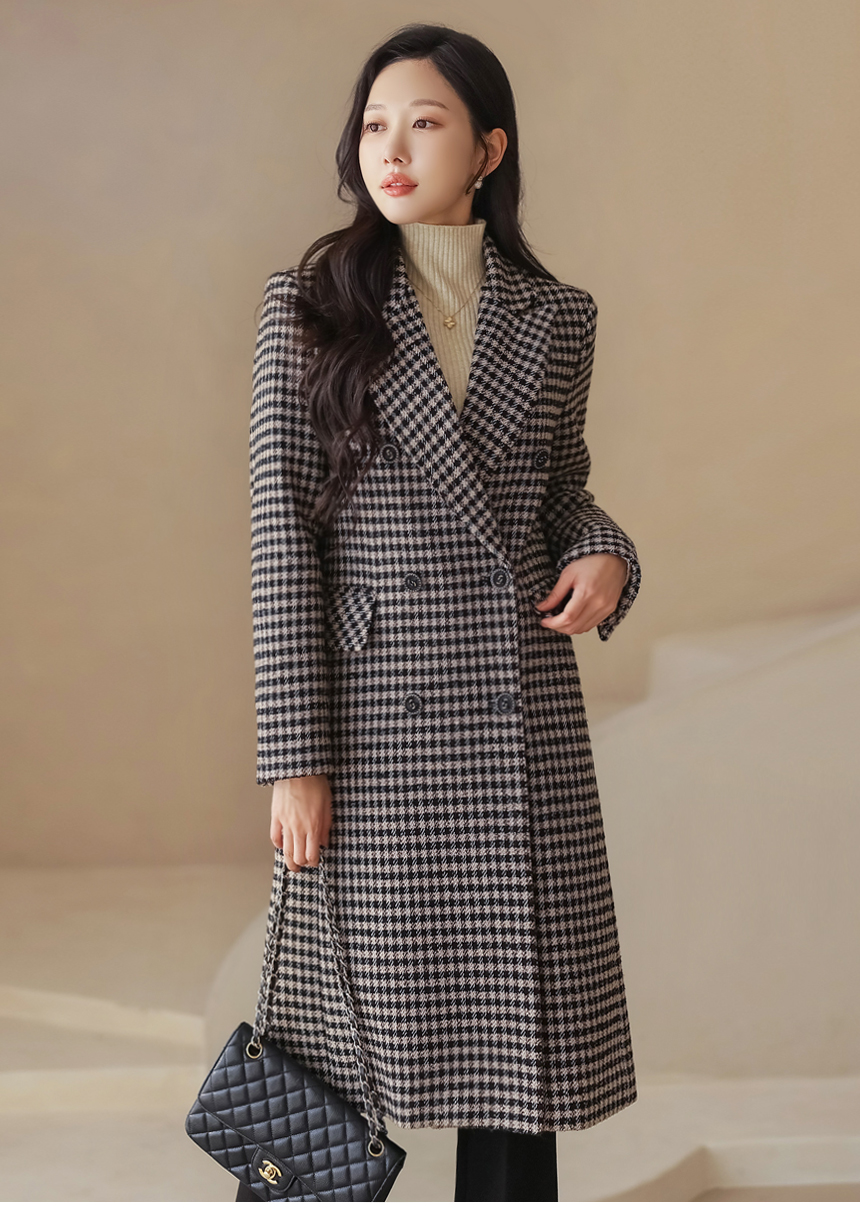 • 하베인 울 블렌딩 모직 클래식 체크 더블 롱 코트
