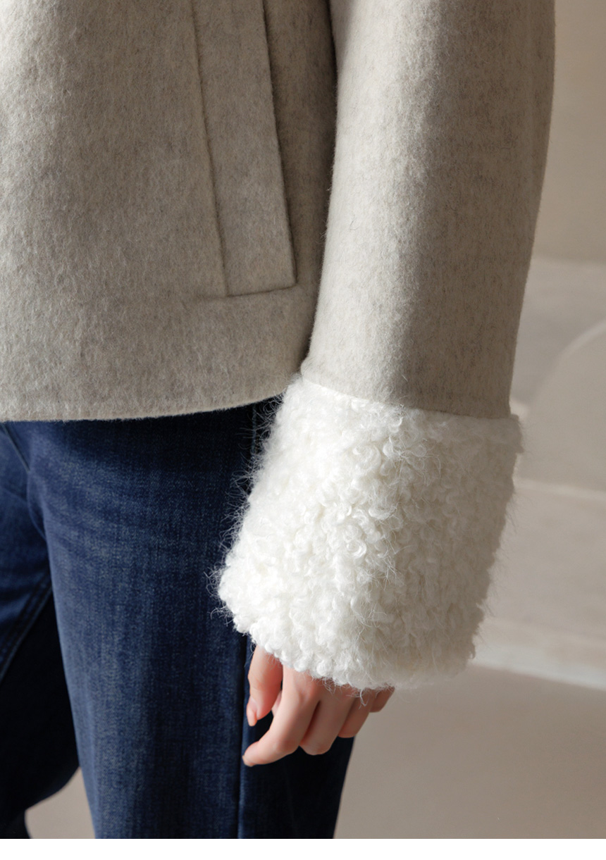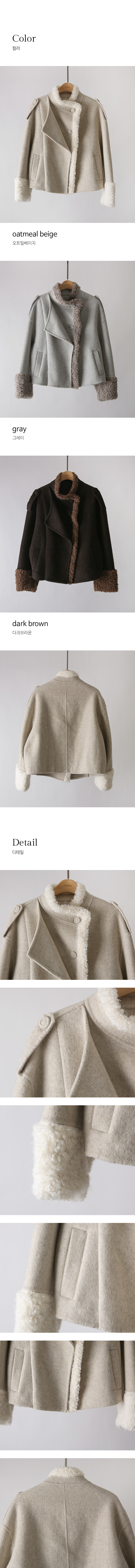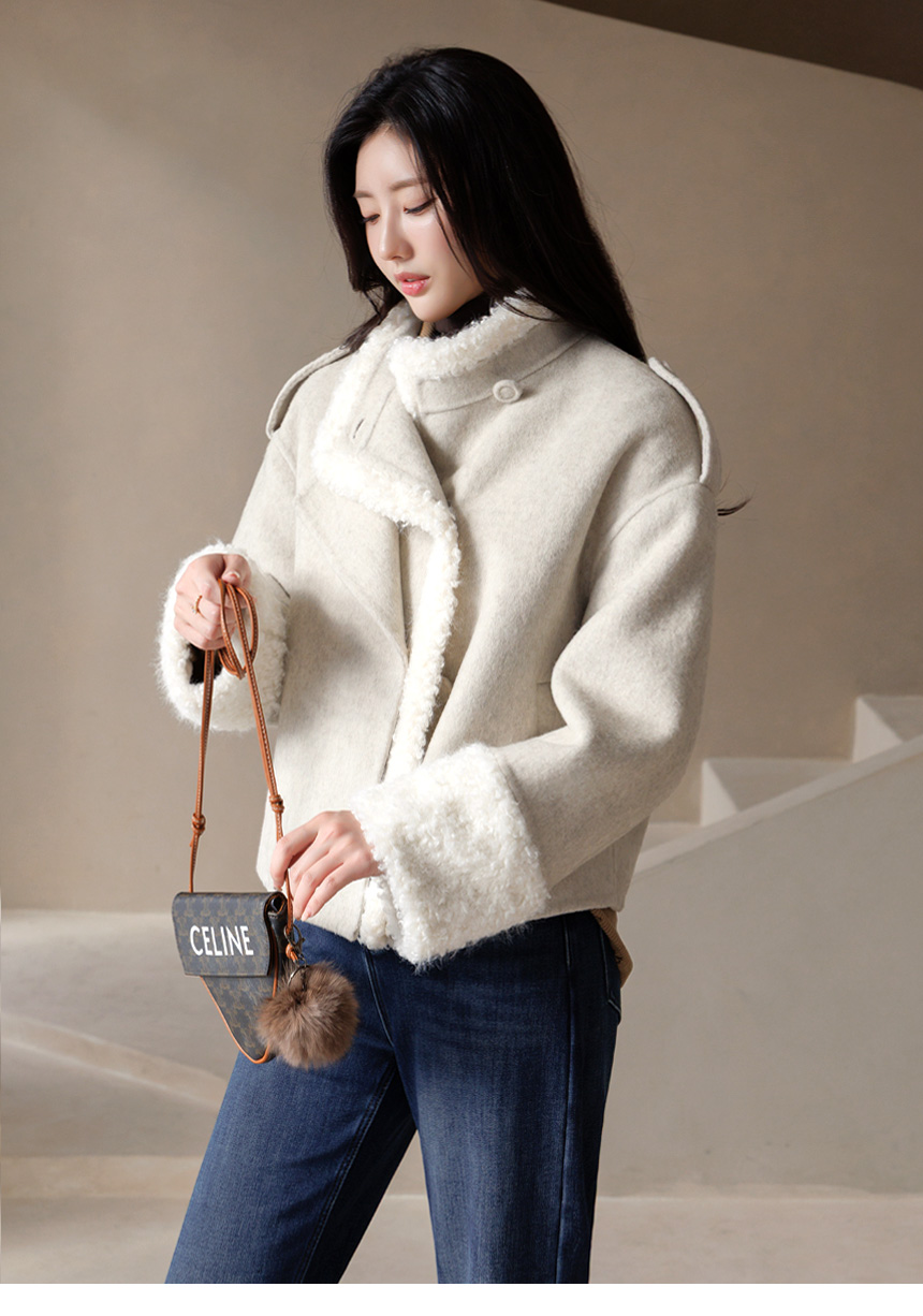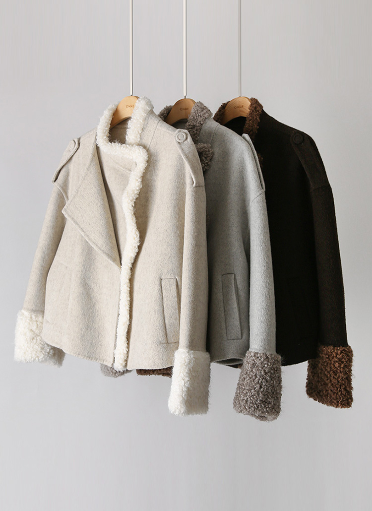 • 로하즈 포근 울 블렌딩 뽀글 양털 트리밍 더블 하이넥 핸드메이드 자켓