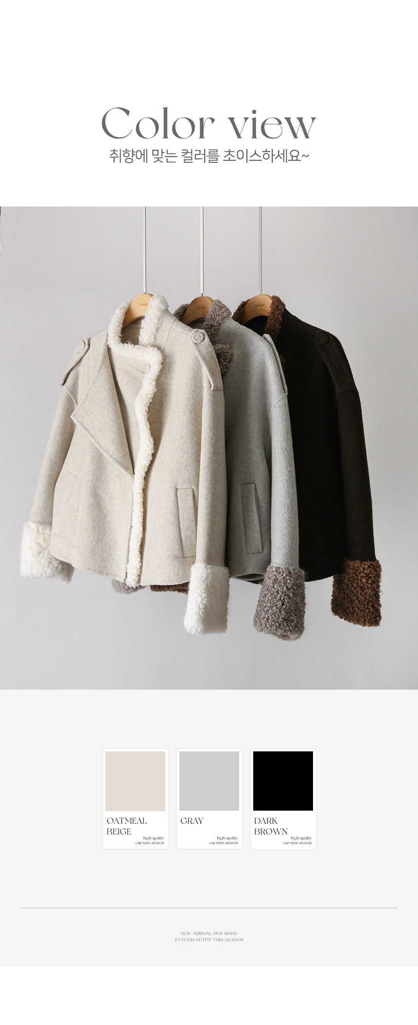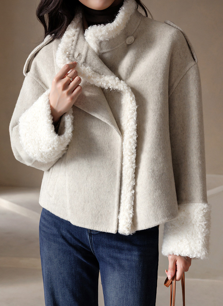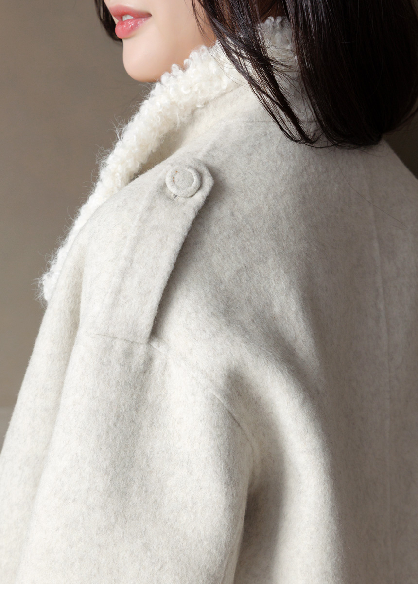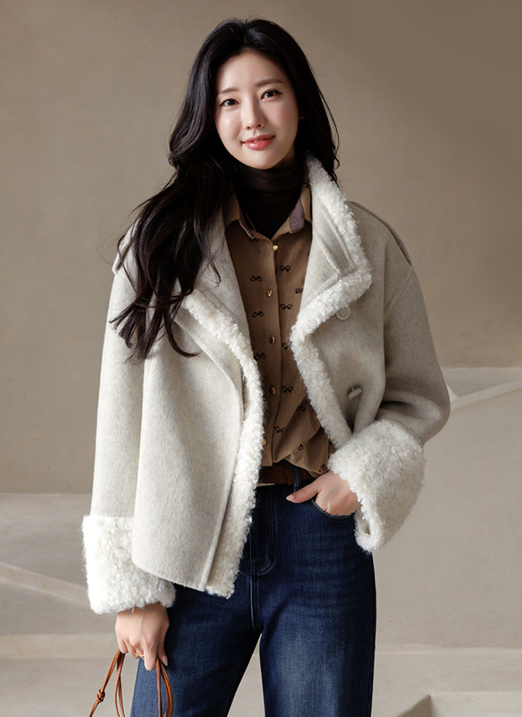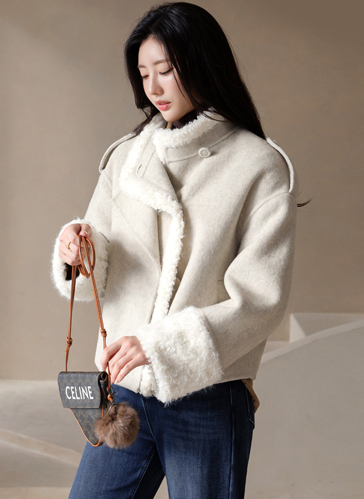 • 로하즈 포근 울 블렌딩 뽀글 양털 트리밍 더블 하이넥 핸드메이드 자켓