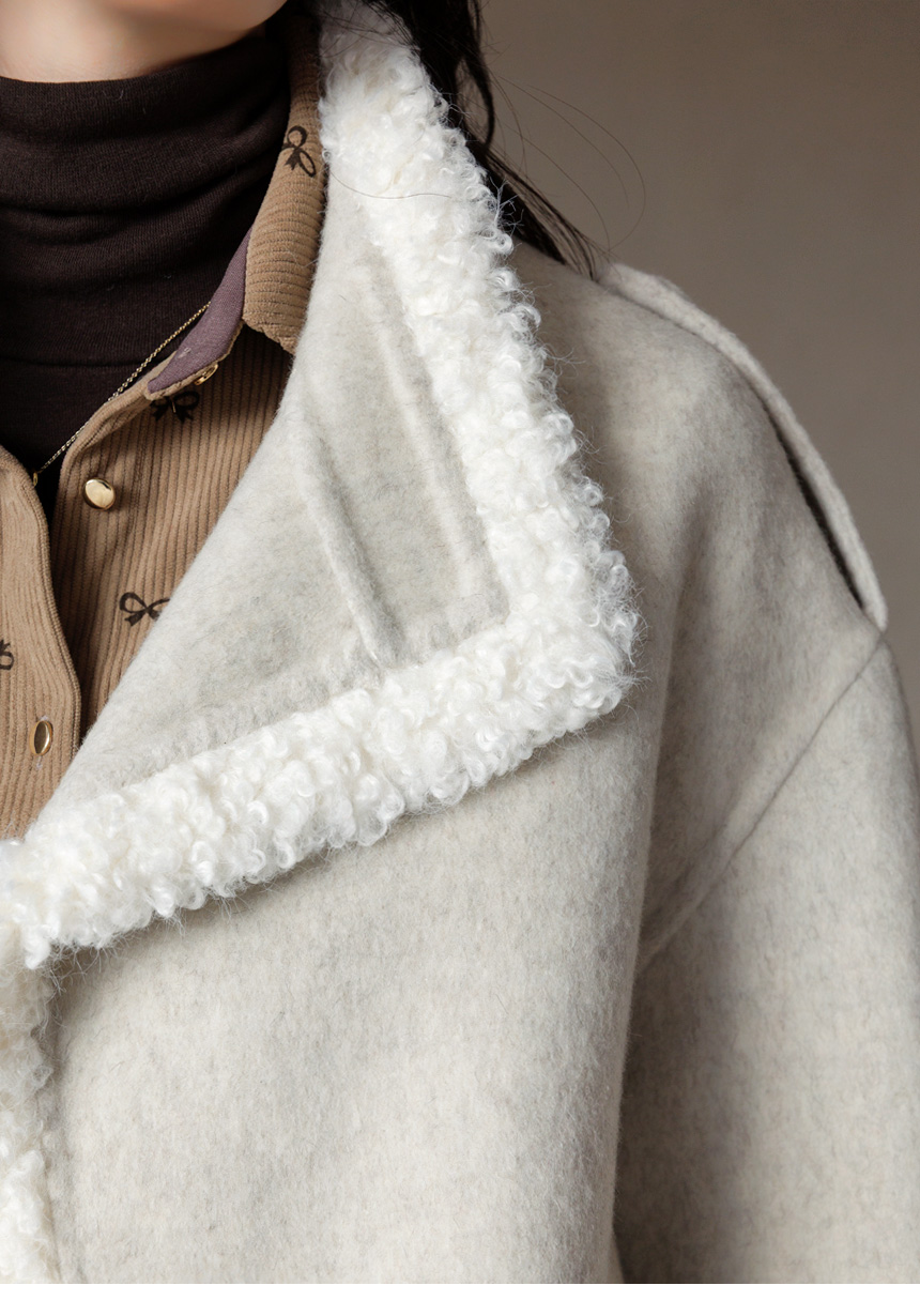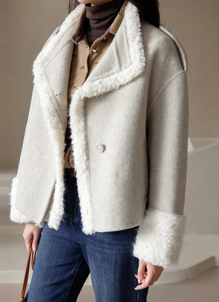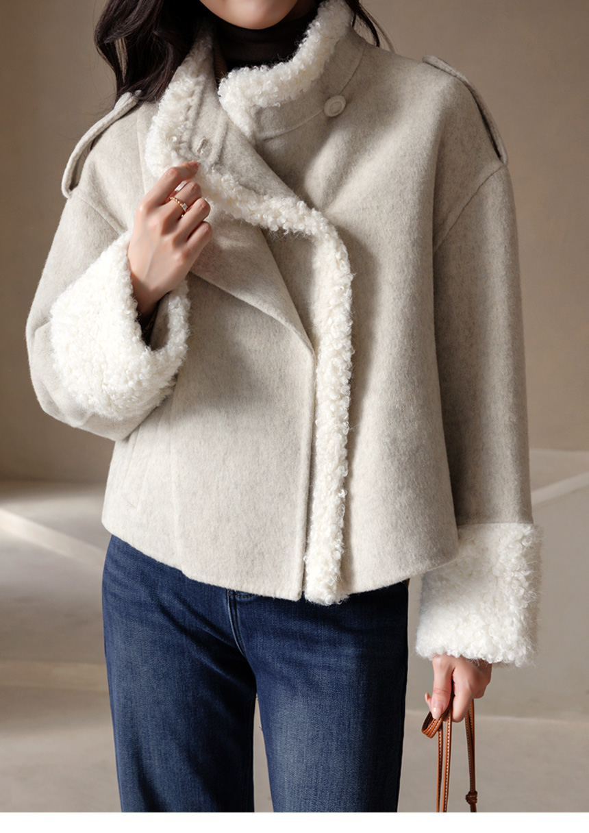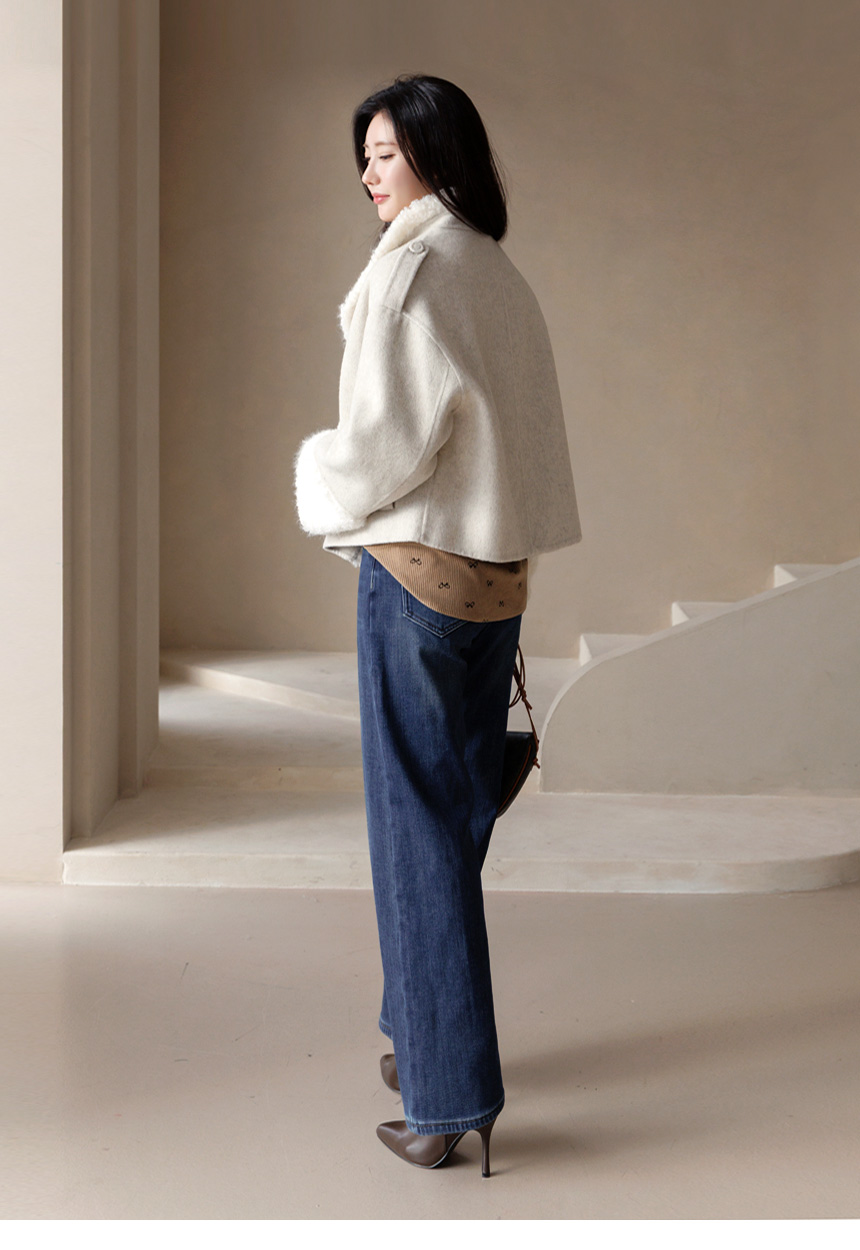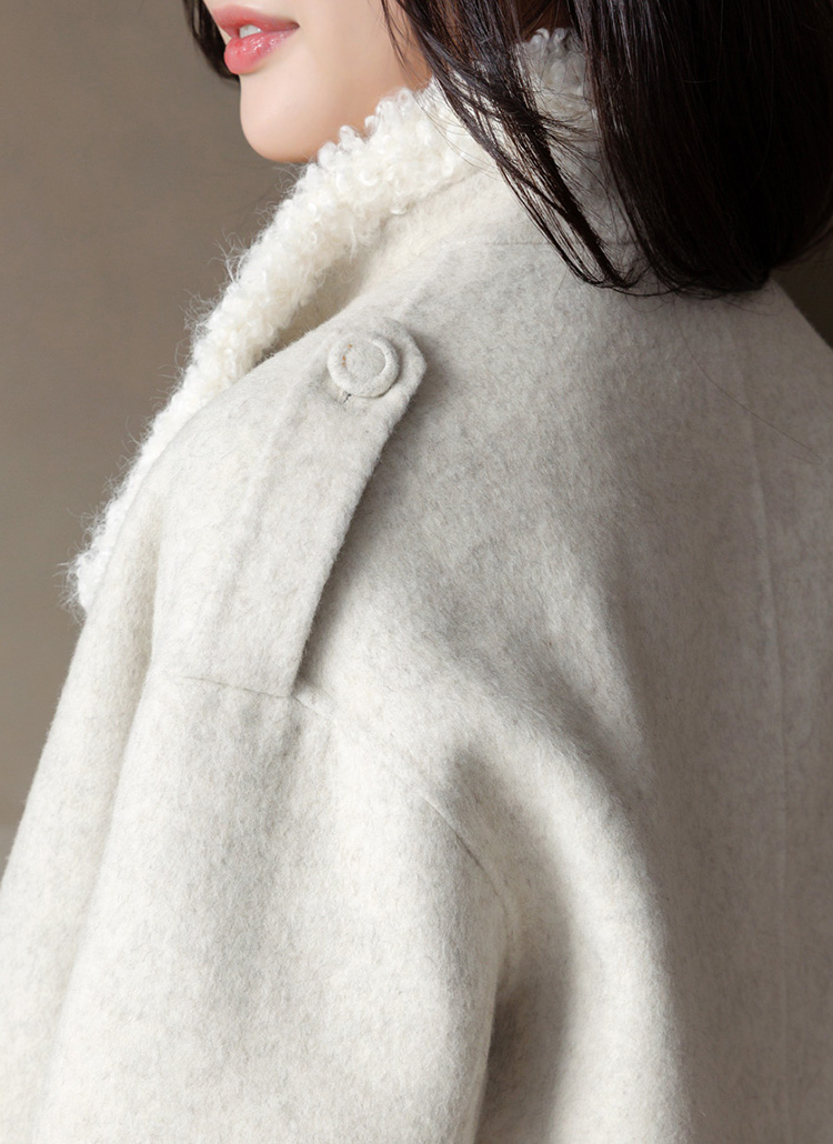 • 로하즈 포근 울 블렌딩 뽀글 양털 트리밍 더블 하이넥 핸드메이드 자켓