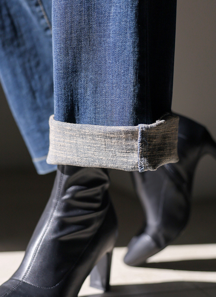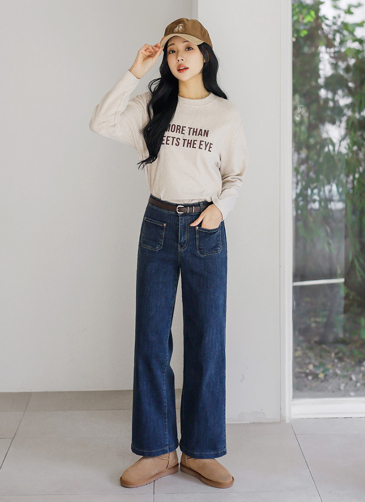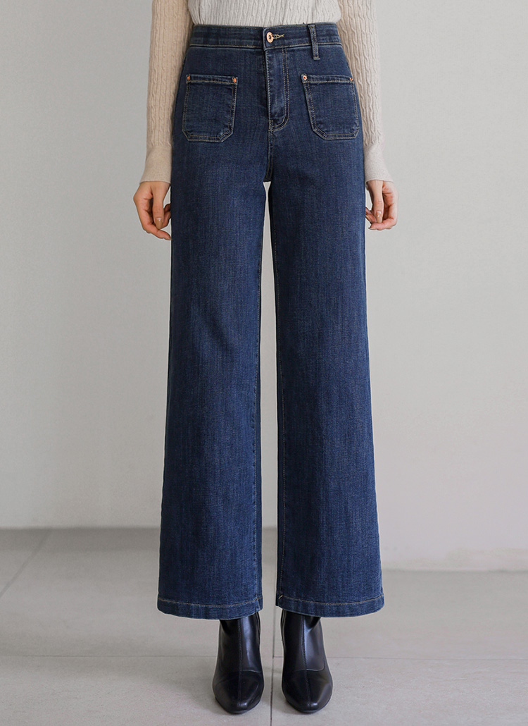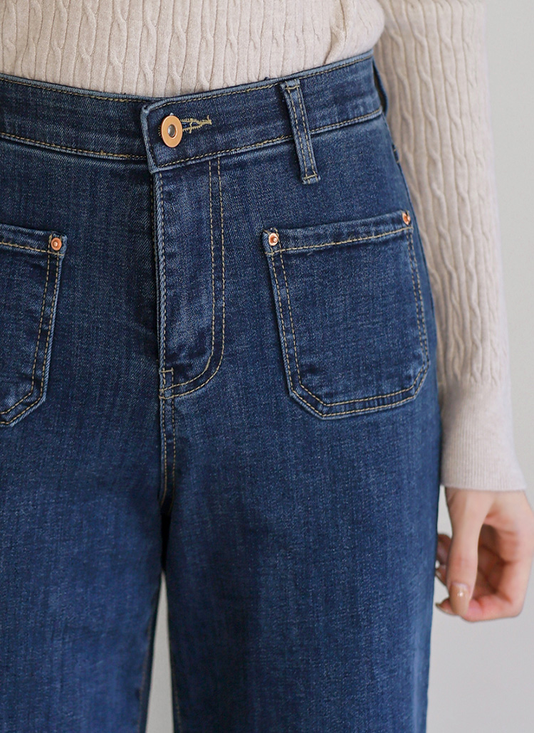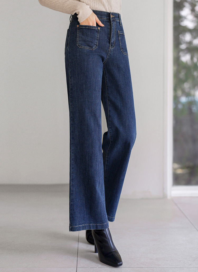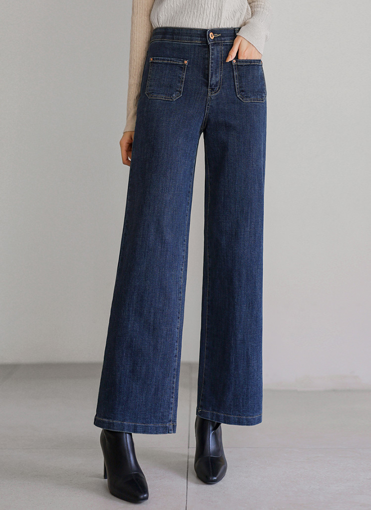 • Deep indigo wide leg denim with a soft brushed lining and subtle stretch, featuring modern front patch pockets that flatter the legs and elevate daily winter styling.
