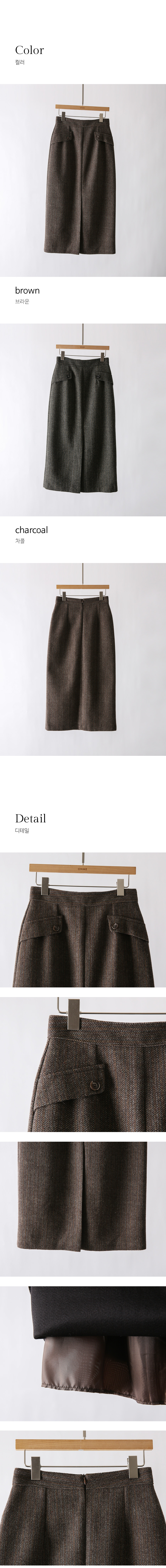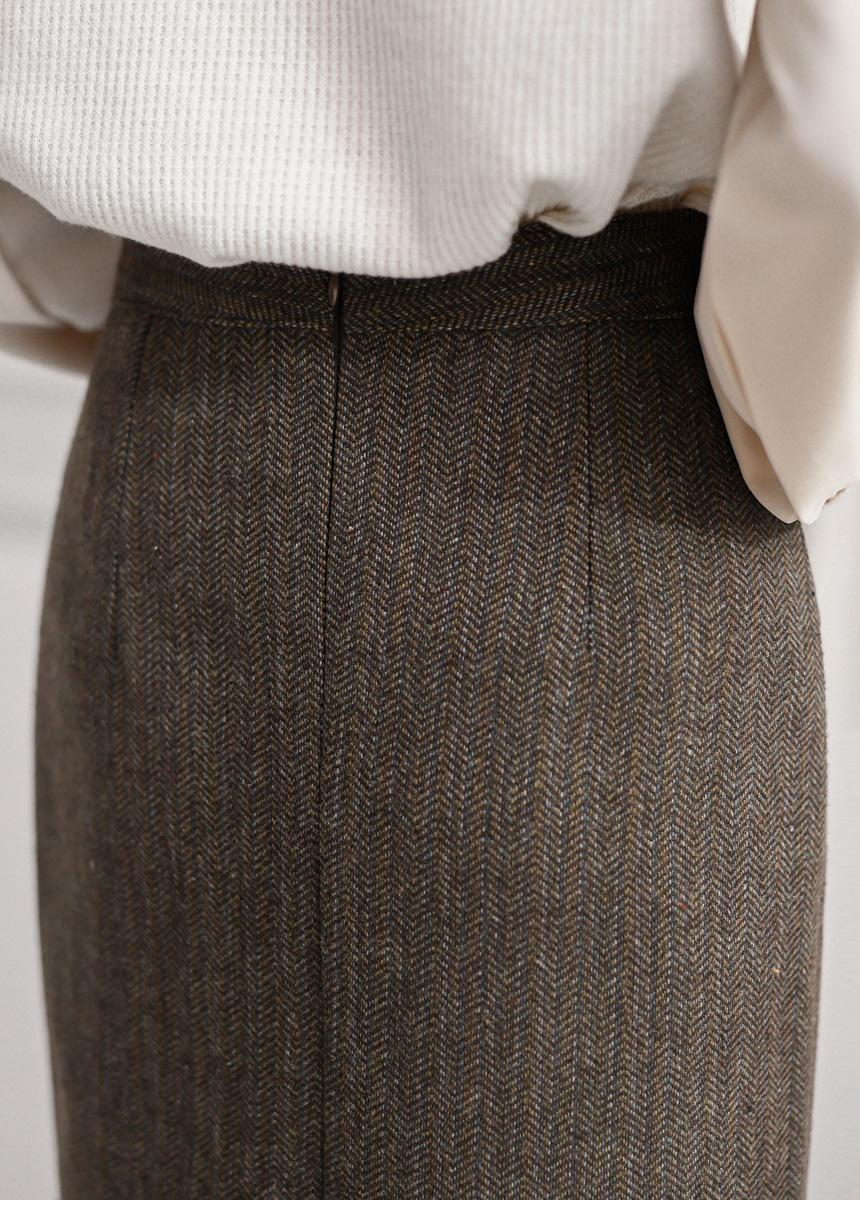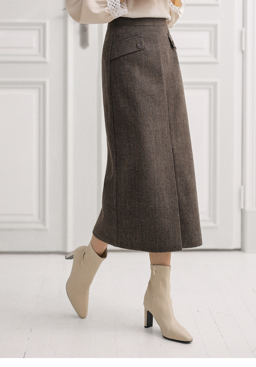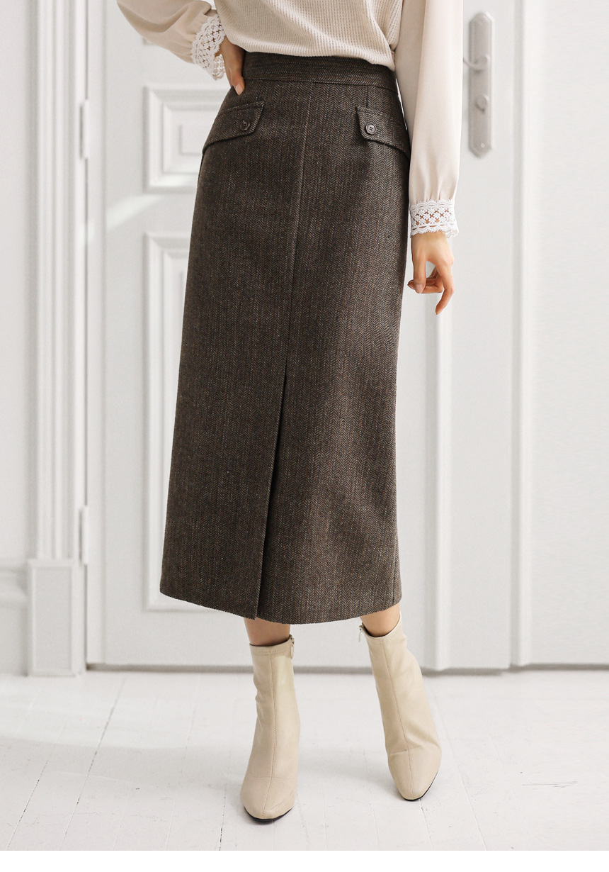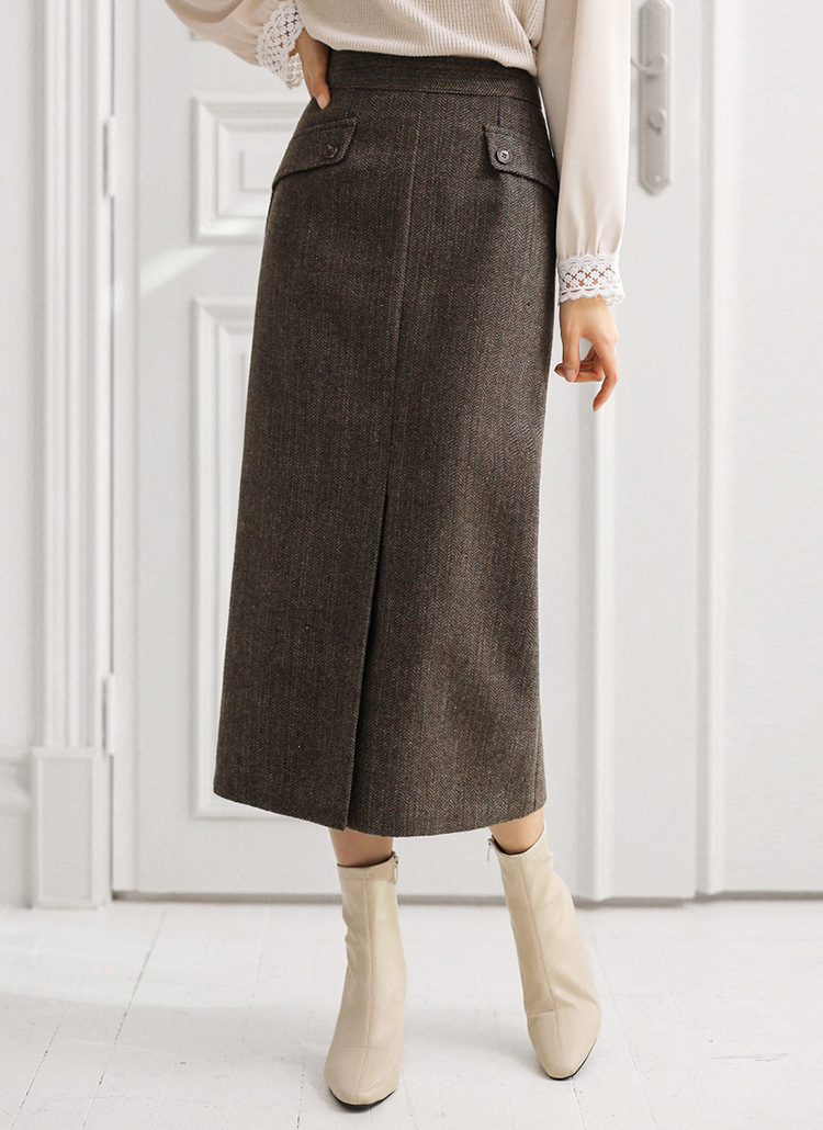 • 헨프 울 헤링본 사선포켓 앞절개 H라인 스커트