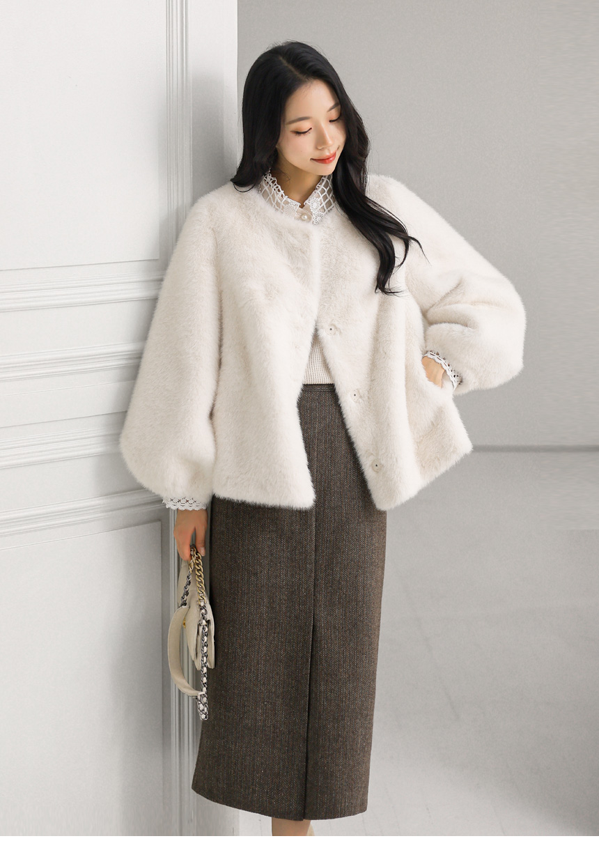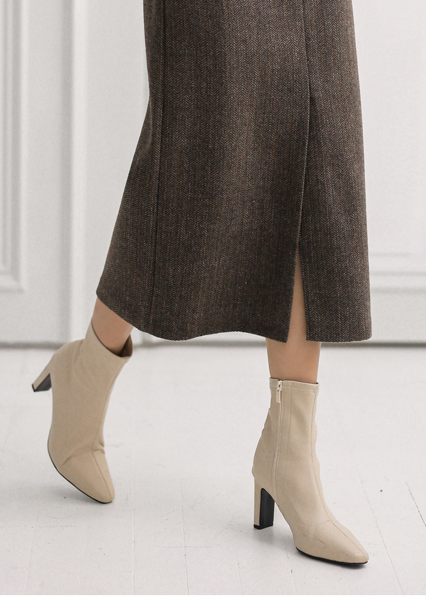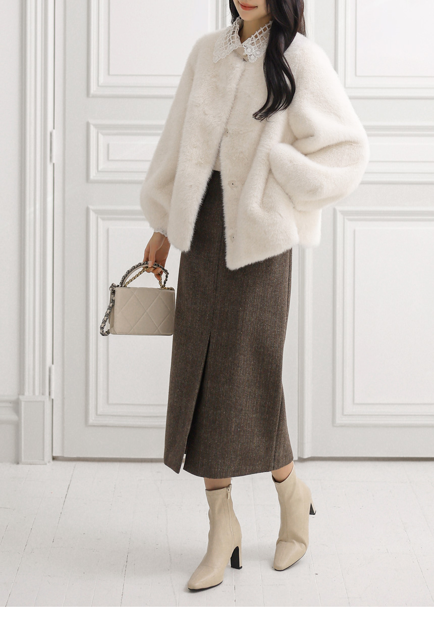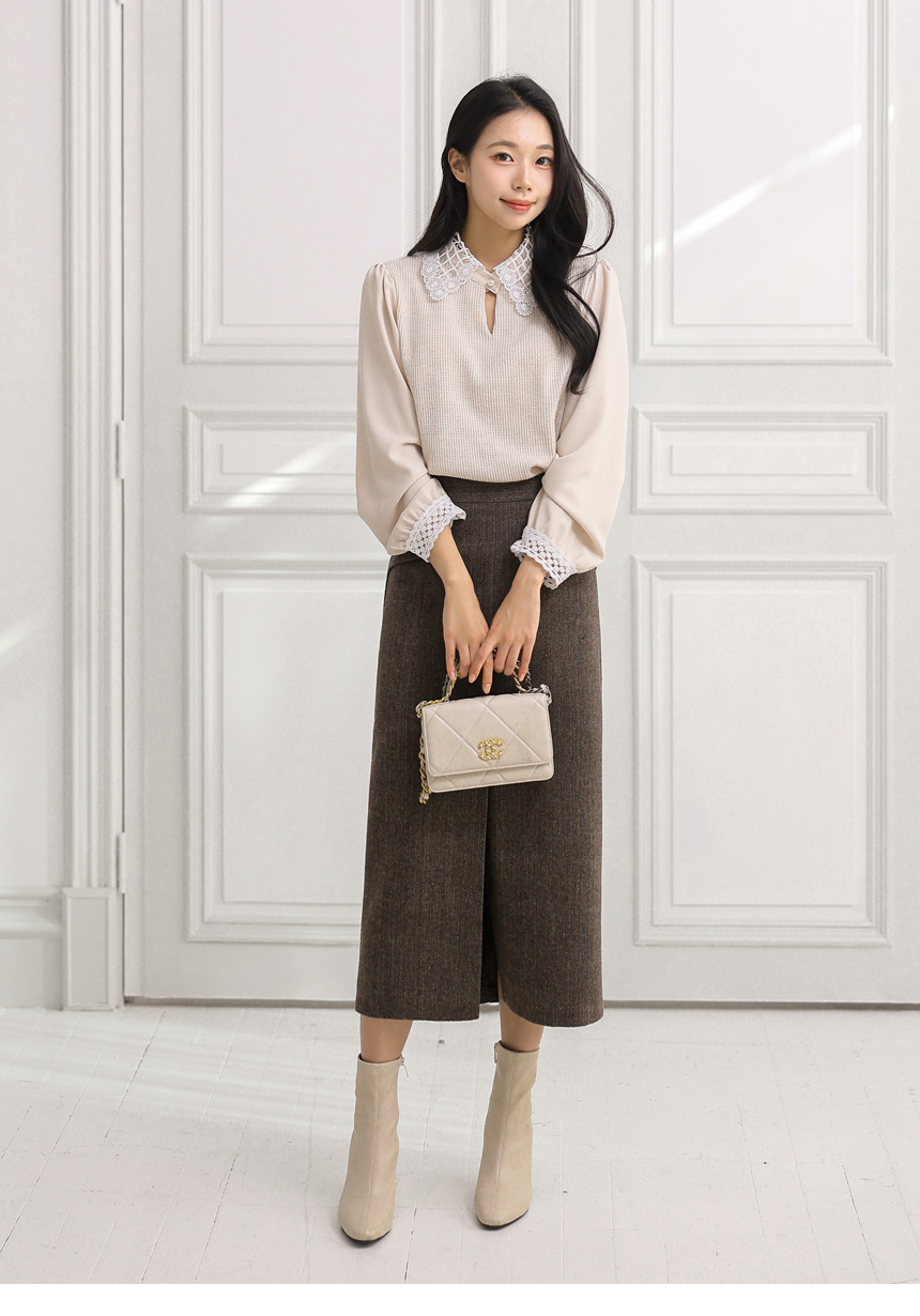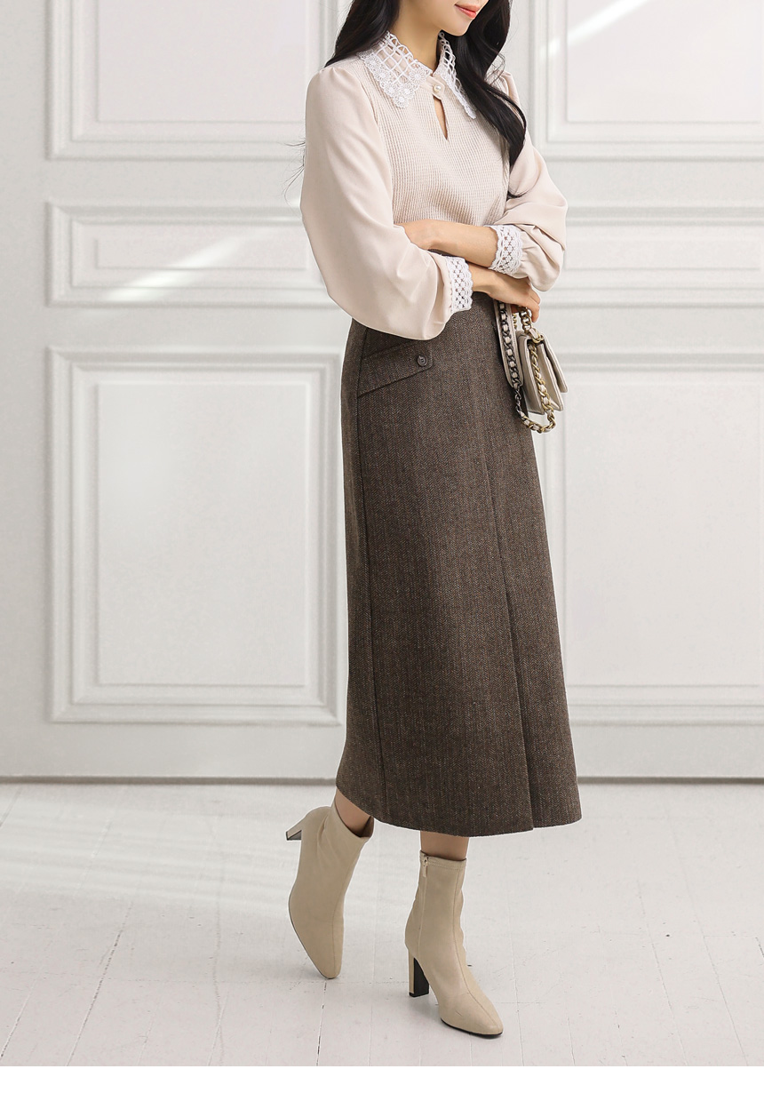 • 헨프 울 헤링본 사선포켓 앞절개 H라인 스커트