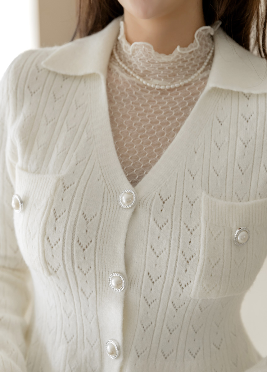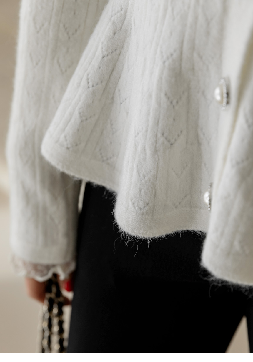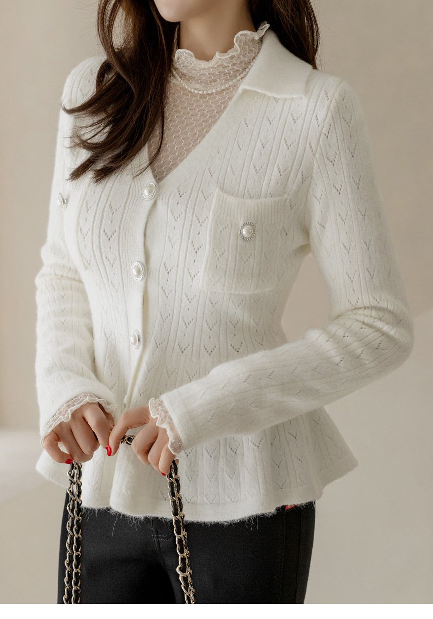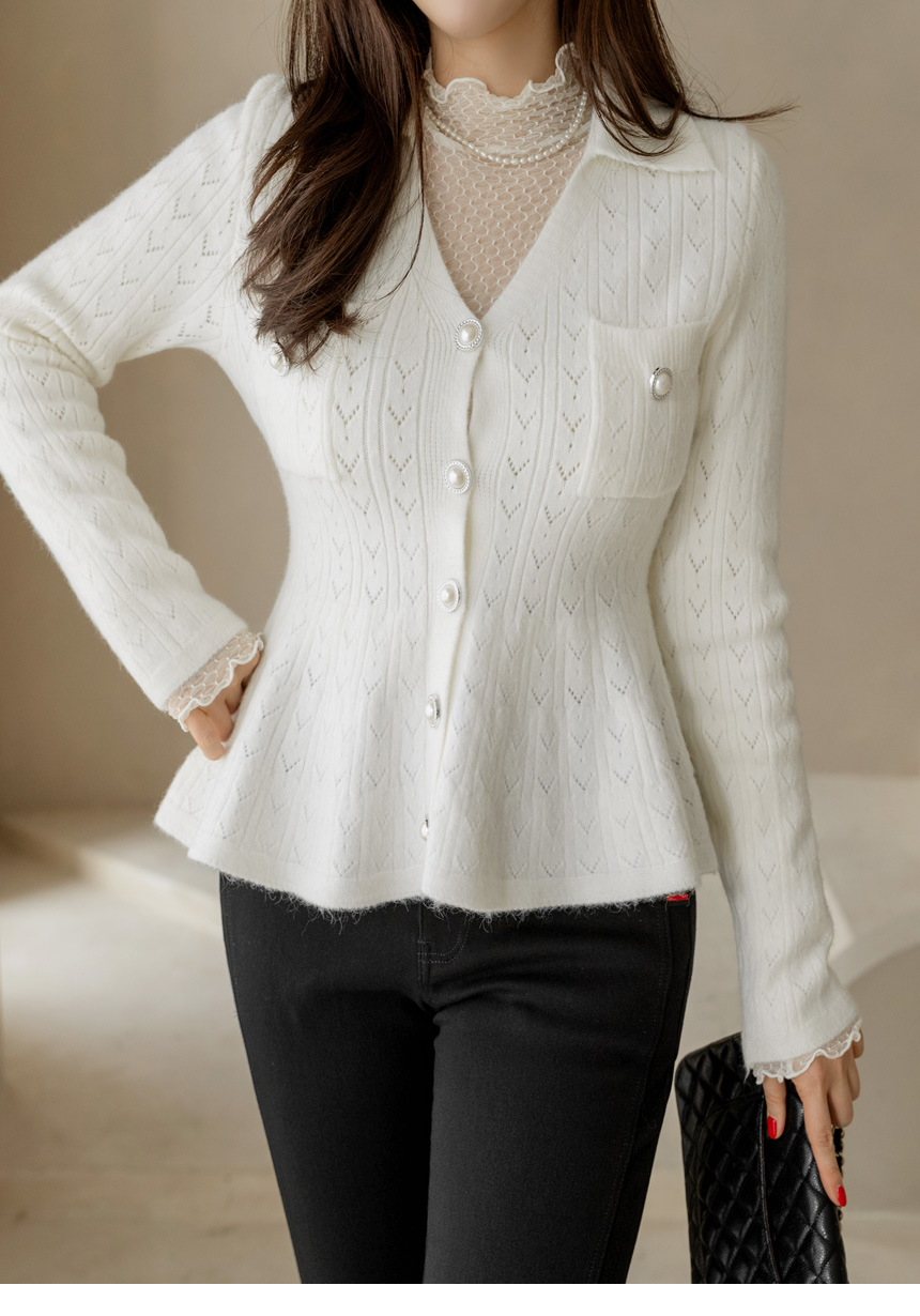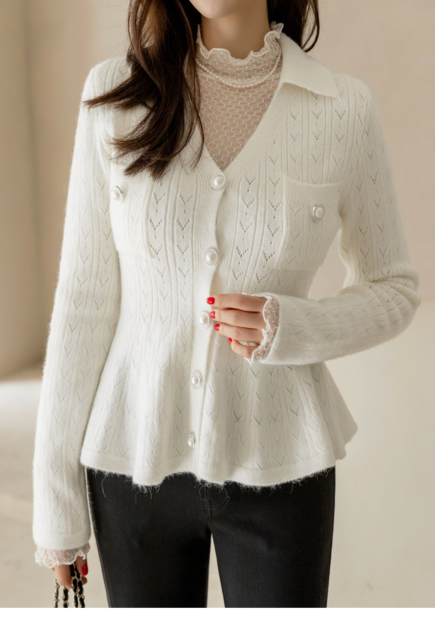 • Designed with airy openwork knit and a subtle peplum silhouette, this cardigan flatters curves beautifully while offering cozy warmth and a polished, feminine mood.