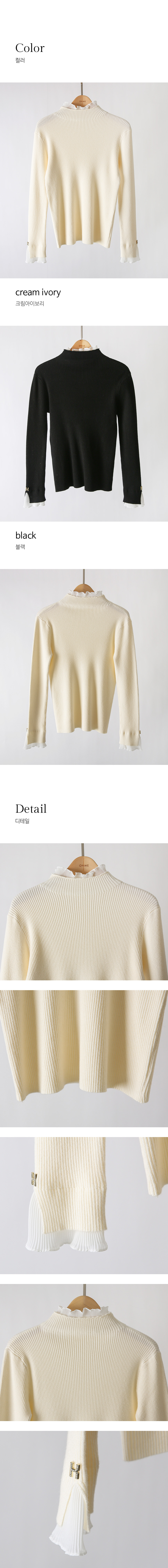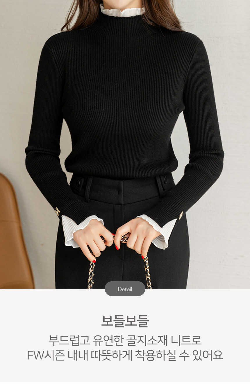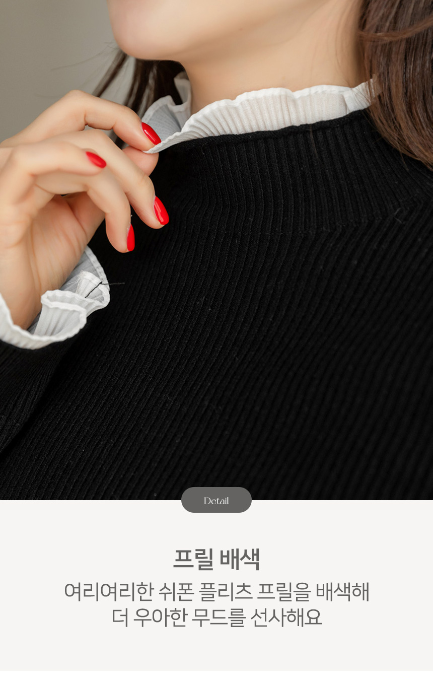 • 엘리마 큐빅 레터링 포인트 쉬폰 플리츠 프릴 배색 반하이넥 니트