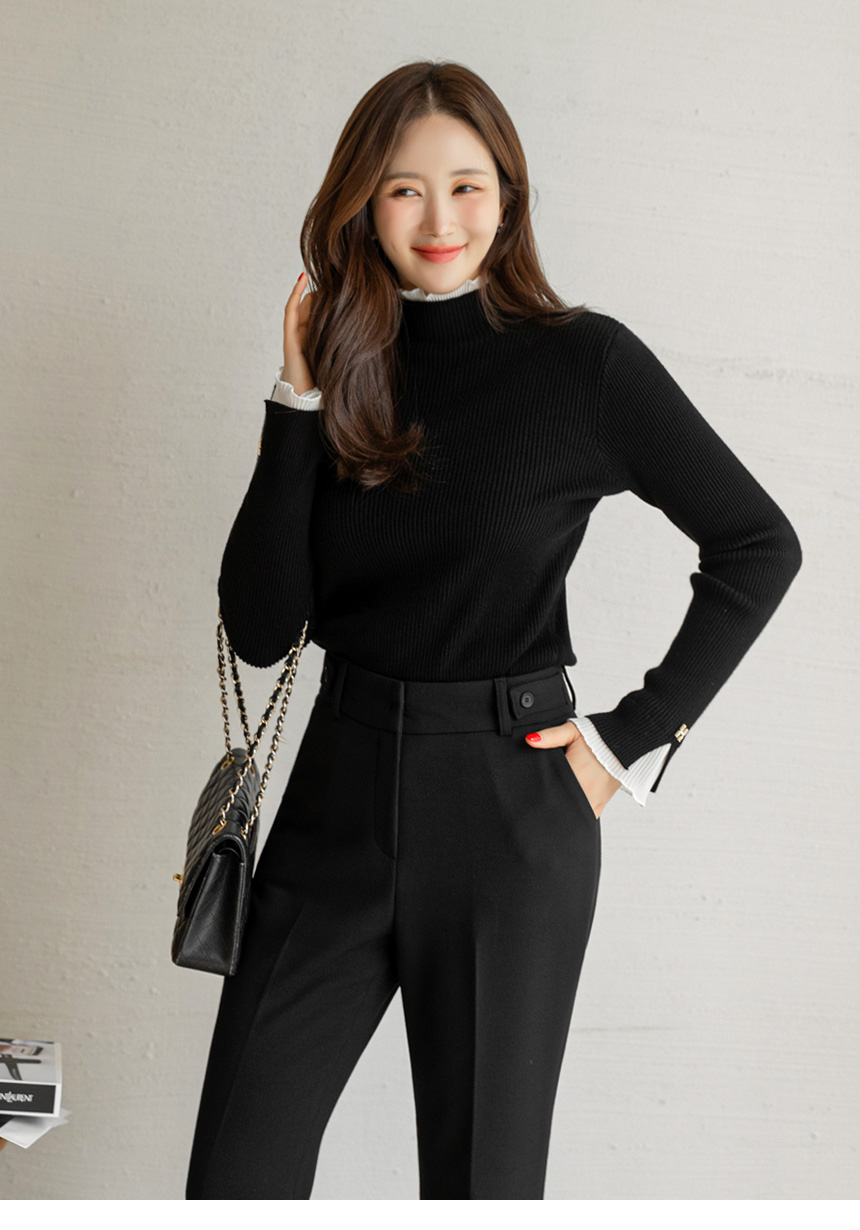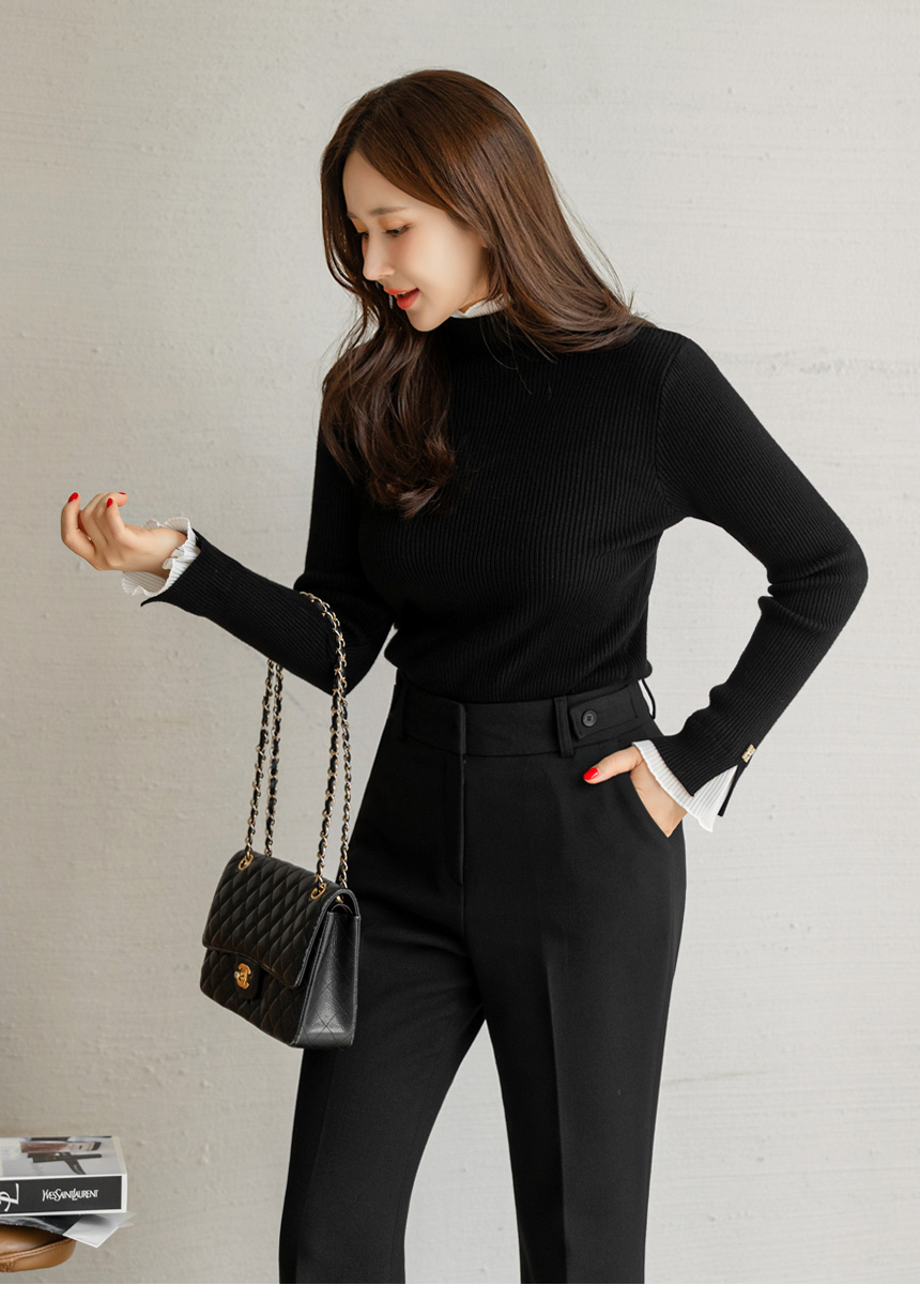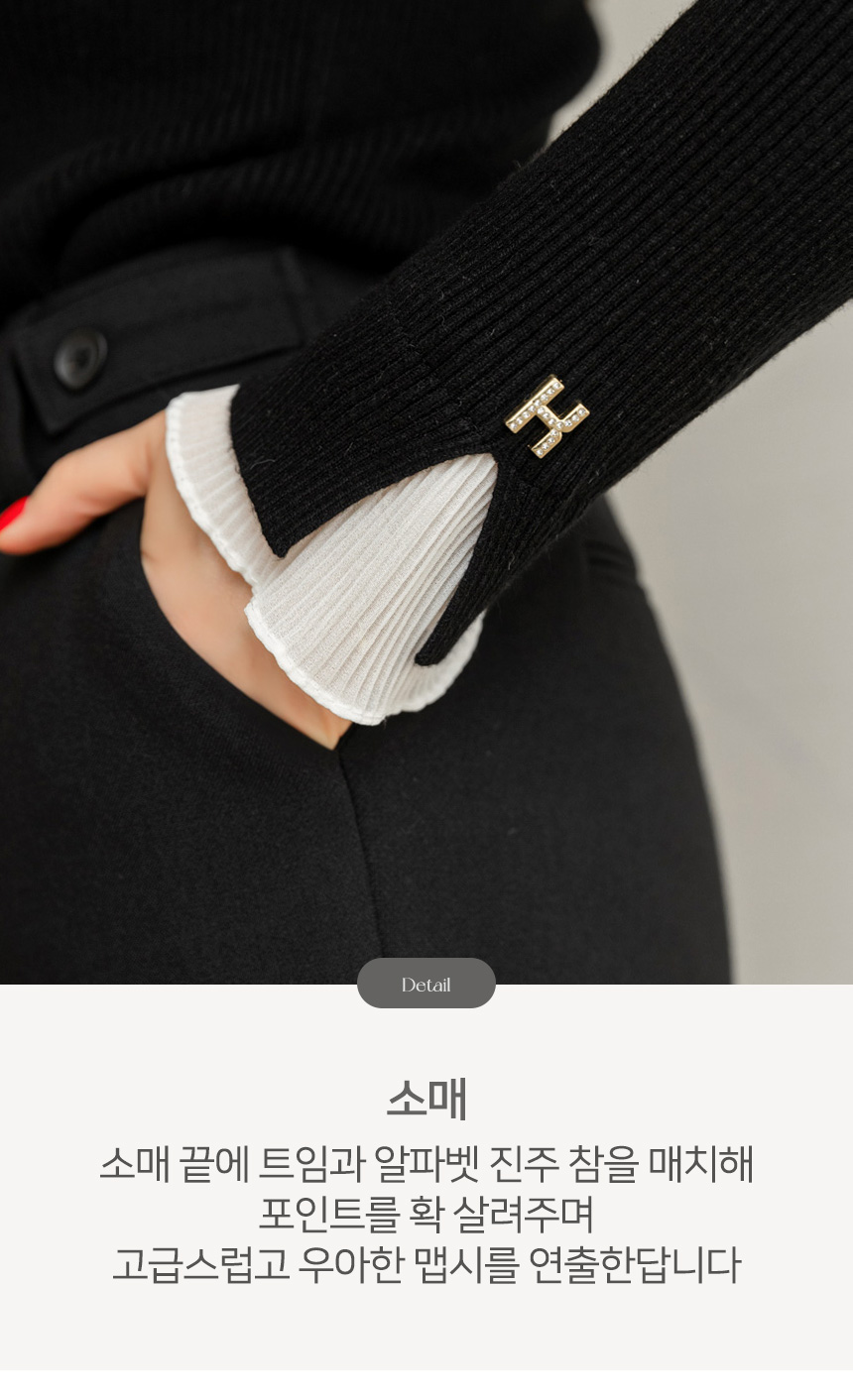 • 엘리마 큐빅 레터링 포인트 쉬폰 플리츠 프릴 배색 반하이넥 니트