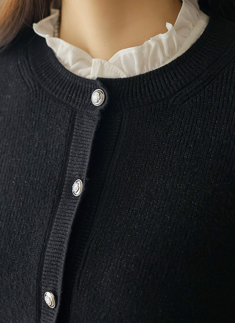 • This elegant round-neck cardigan features a soft viscose-blend knit with delicate metallic shimmer, finished with silver buttons and a clean silhouette for office and daily styling.