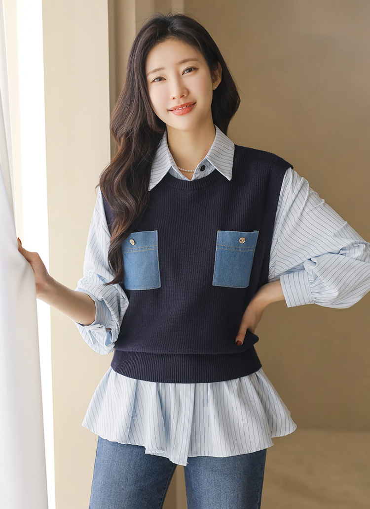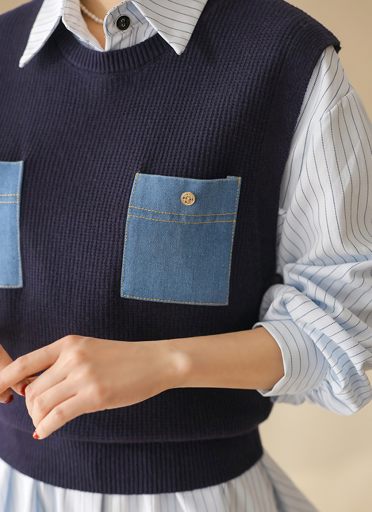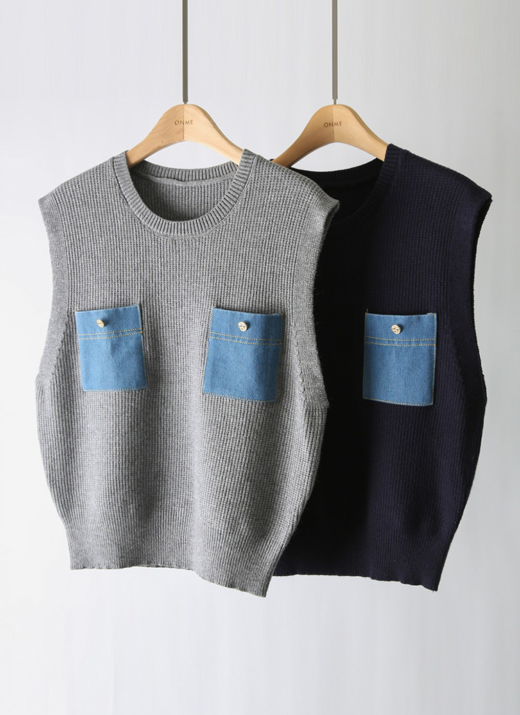 • A versatile knit vest accented with denim pockets and subtle gold buttons, offering a smart casual mood perfect for layering over shirts or dresses year-round.