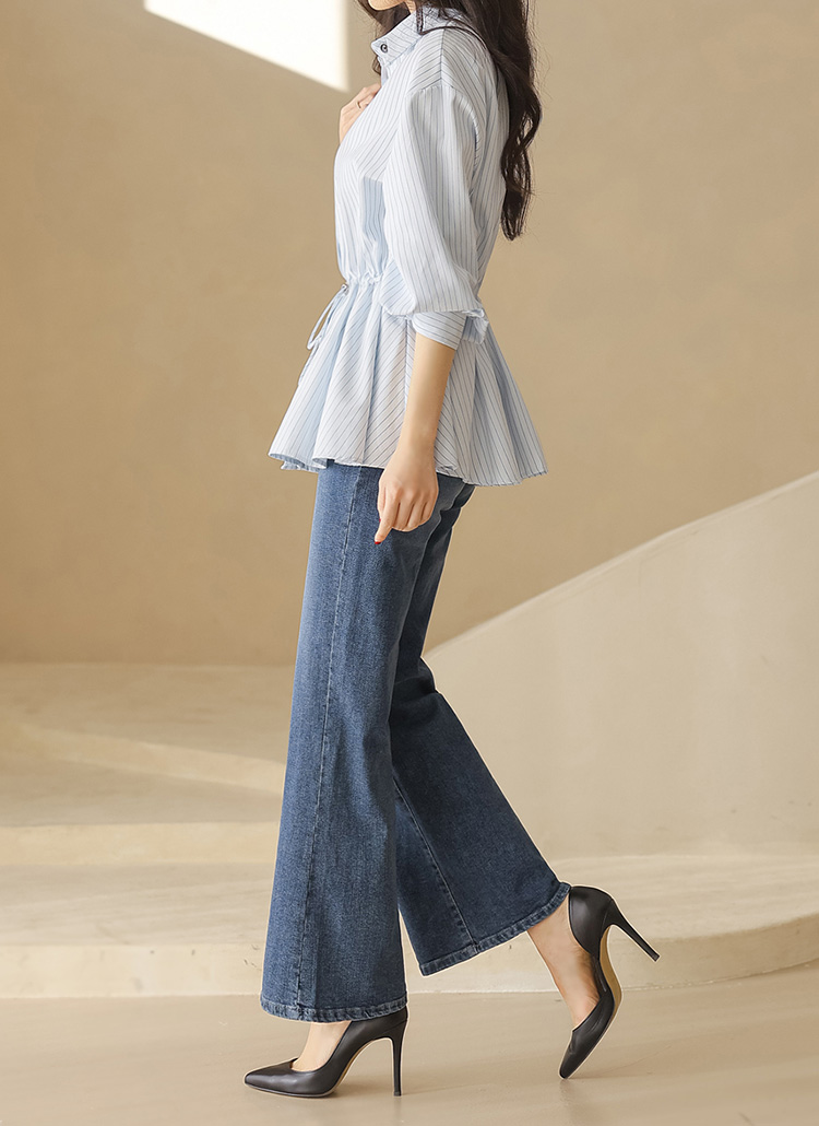 • A clean striped blouse with adjustable waist ties and a softly flared hem, delivering a flattering fit that transitions easily from work settings to casual days.