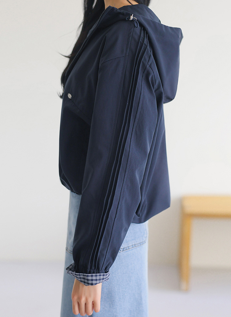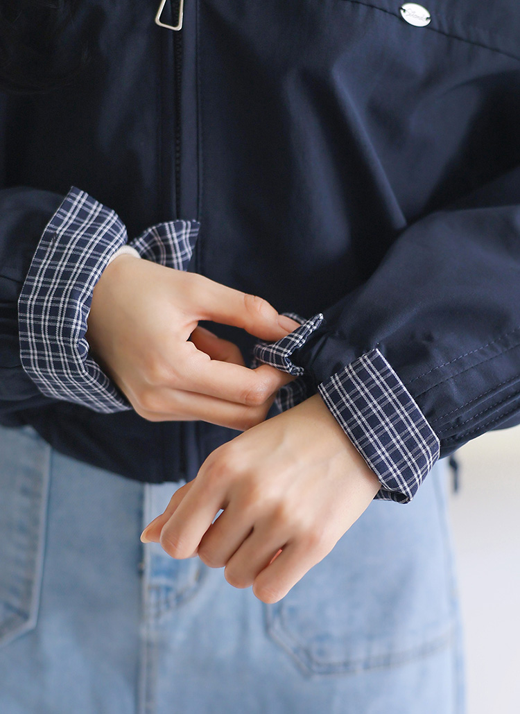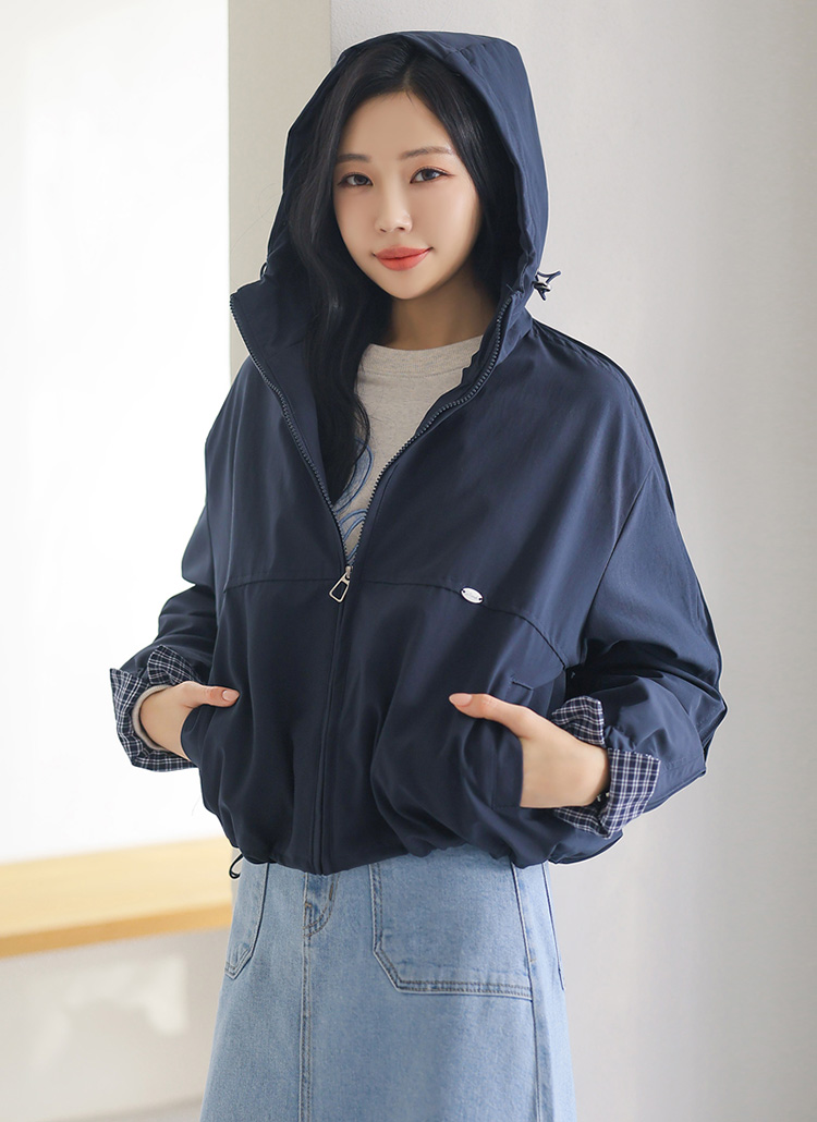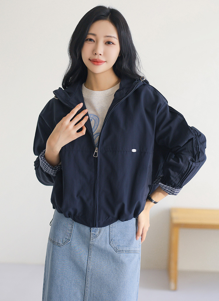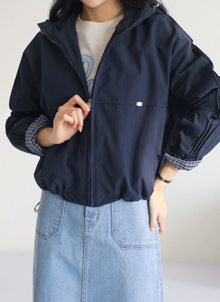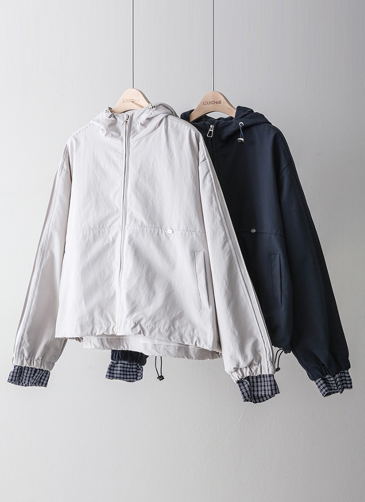 • A stylish hooded zip-up jacket with check layered cuffs and pintuck detail sleeves. Wind-resistant fabric, adjustable strings, and subtle silver detail elevate everyday casual looks.