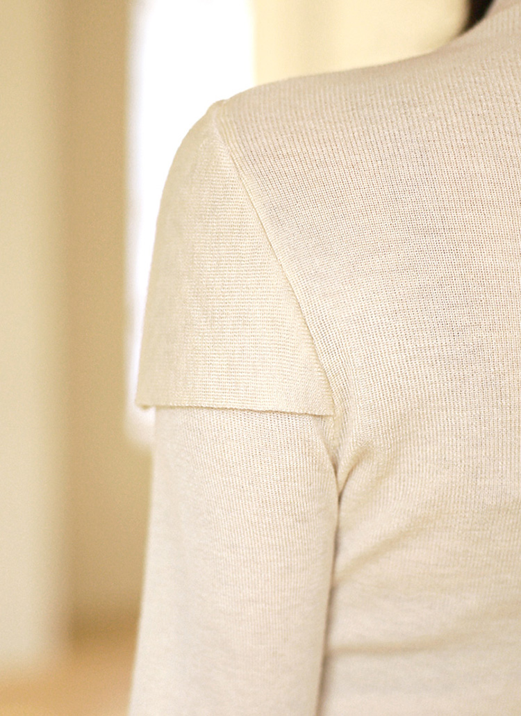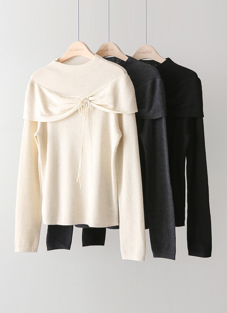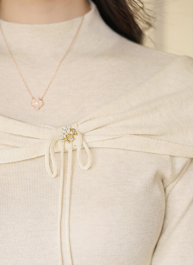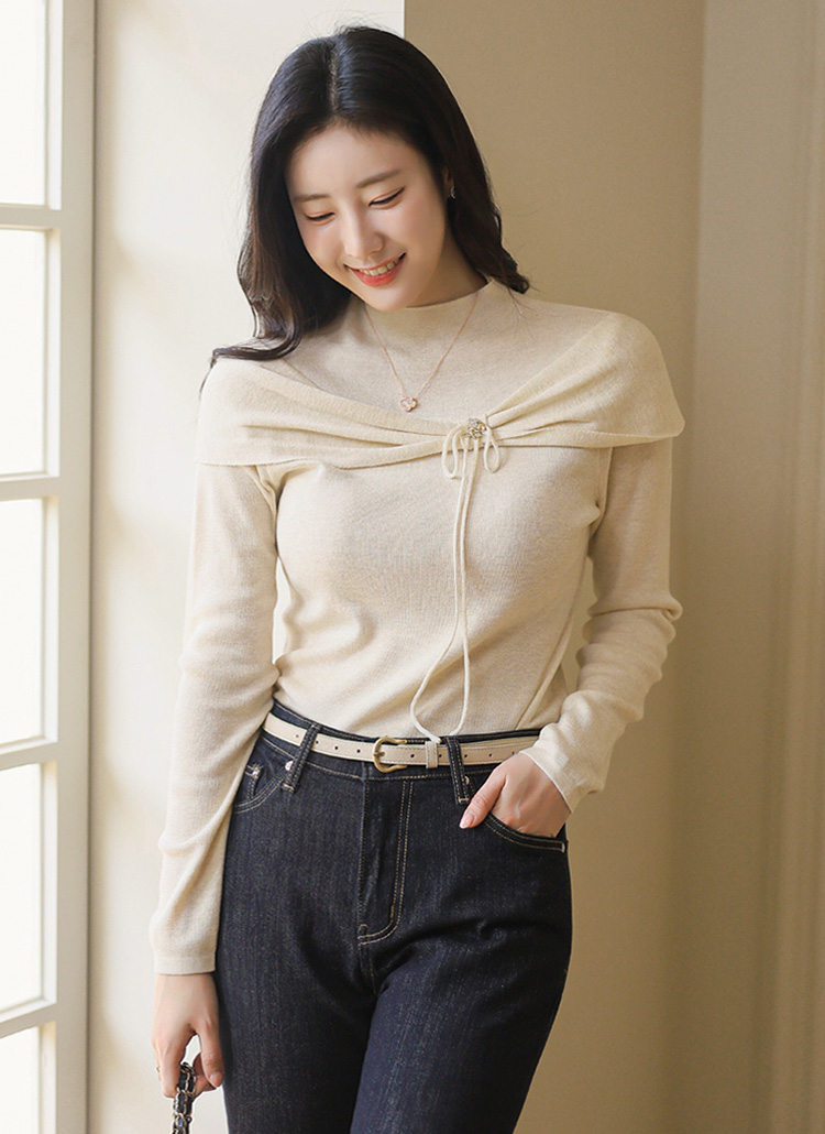 • Designed with a cape-like shoulder cover and subtle jewel accent, this slim-fit knit offers gentle warmth, stretch comfort, and feminine sophistication.