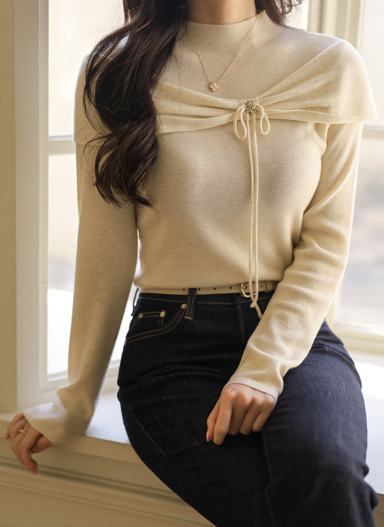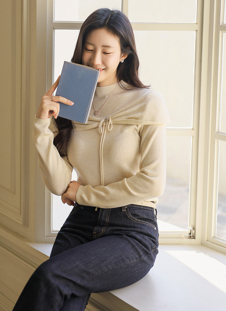 어깨에 숄을 살짝 걸친 듯한 연출이 돋보이는 반하이넥 니트에요