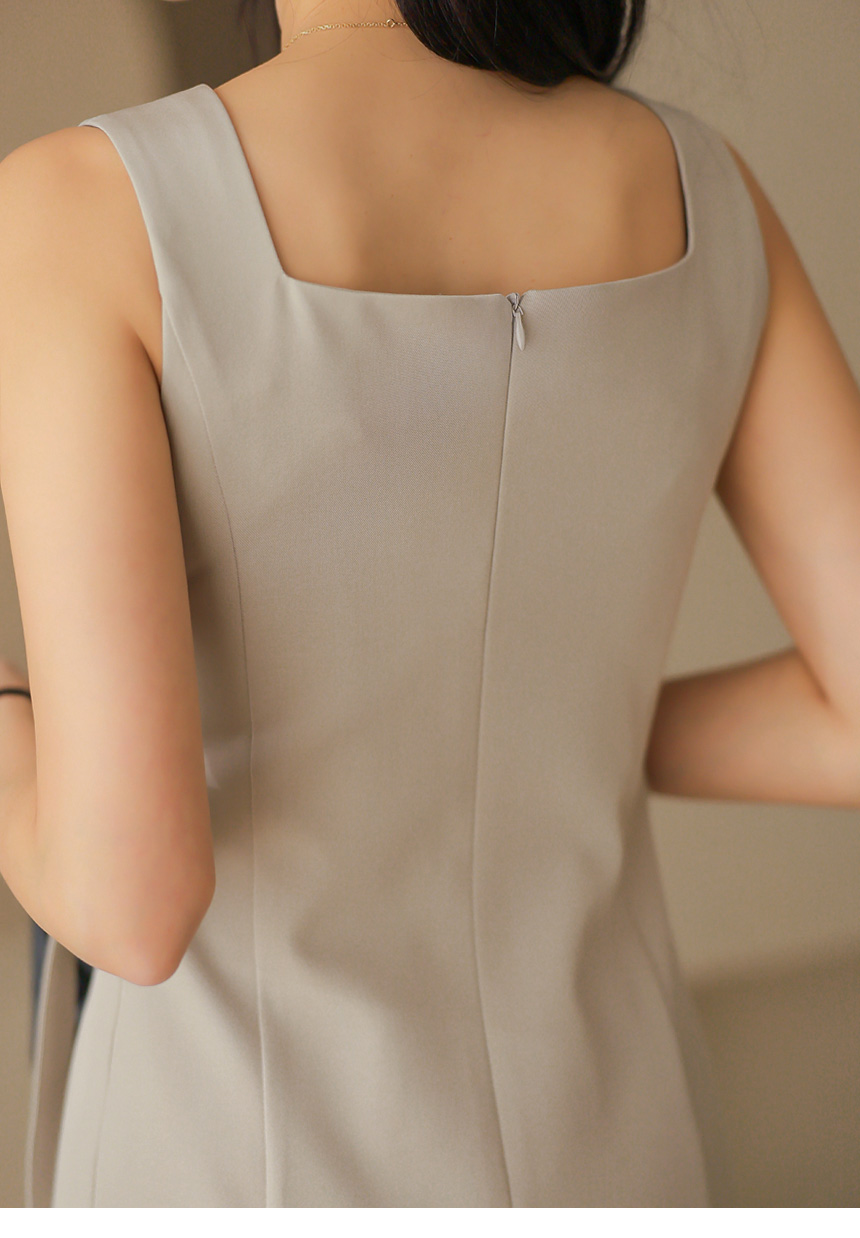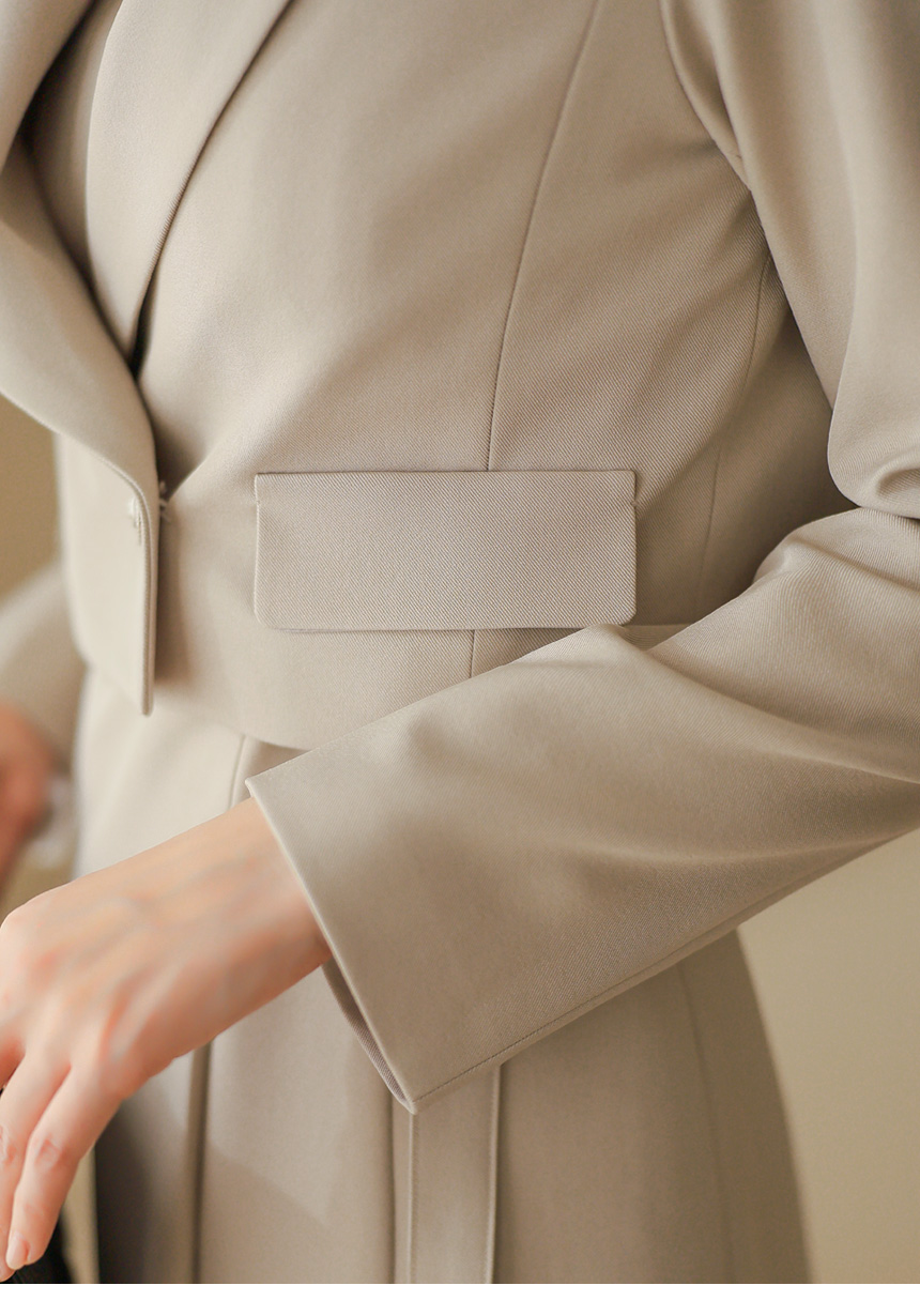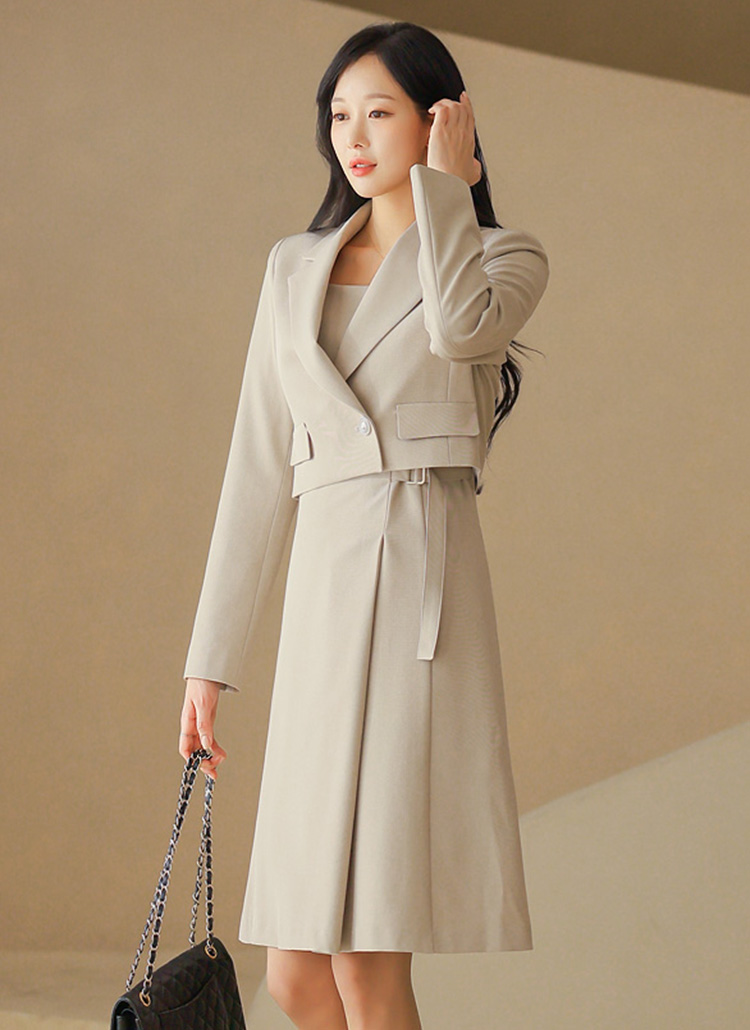 • A polished two-piece set featuring a structured crop jacket and a sleek sleeveless dress with a waist buckle, creating a refined and versatile silhouette.