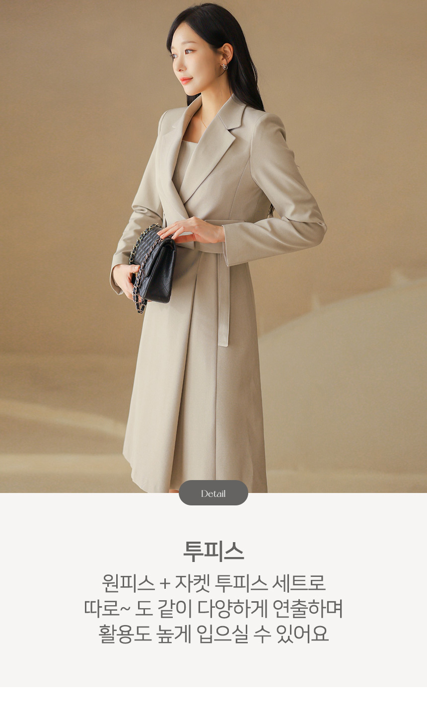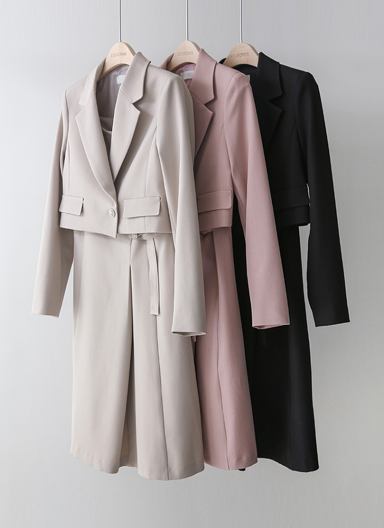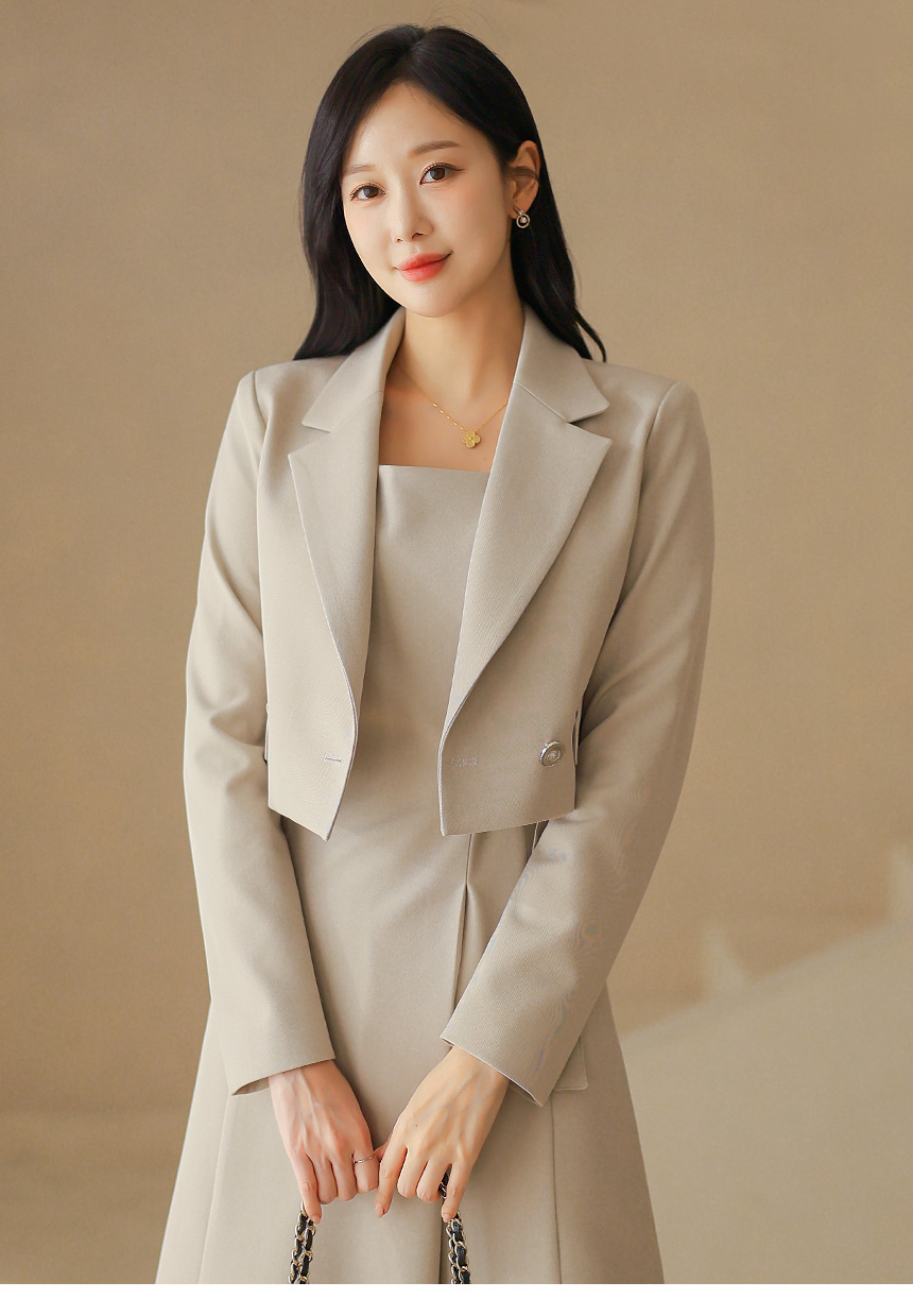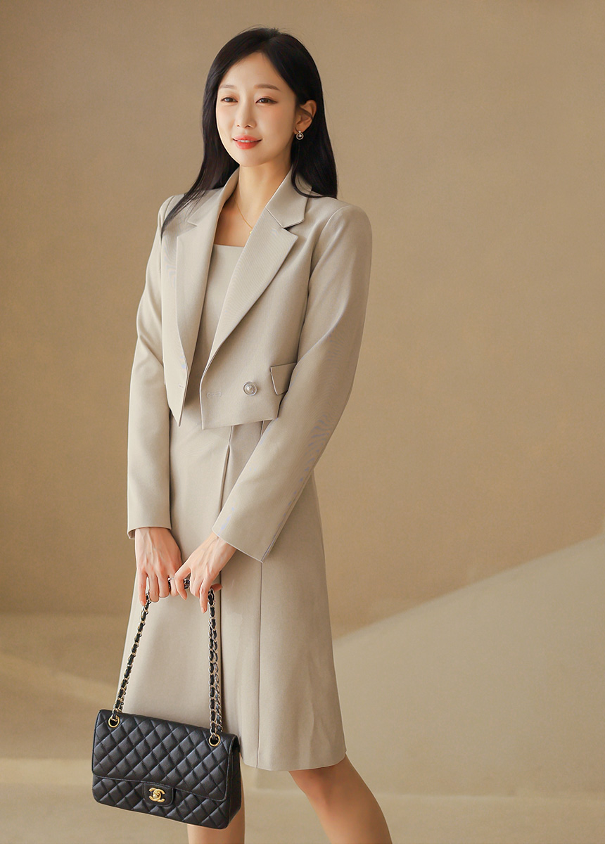 크롭 기장의 더블 자켓과 민소매 원피스가 세트로 구성된 투피스에요