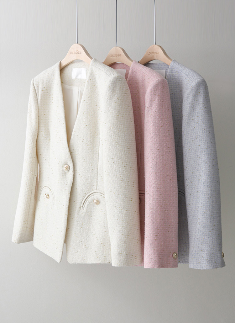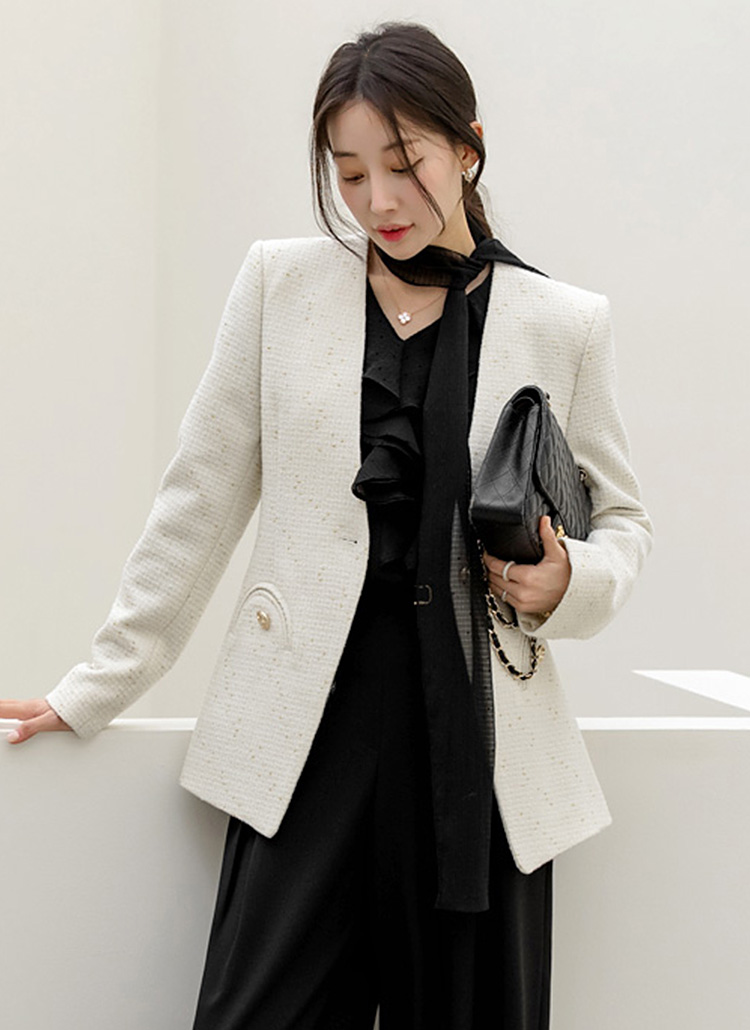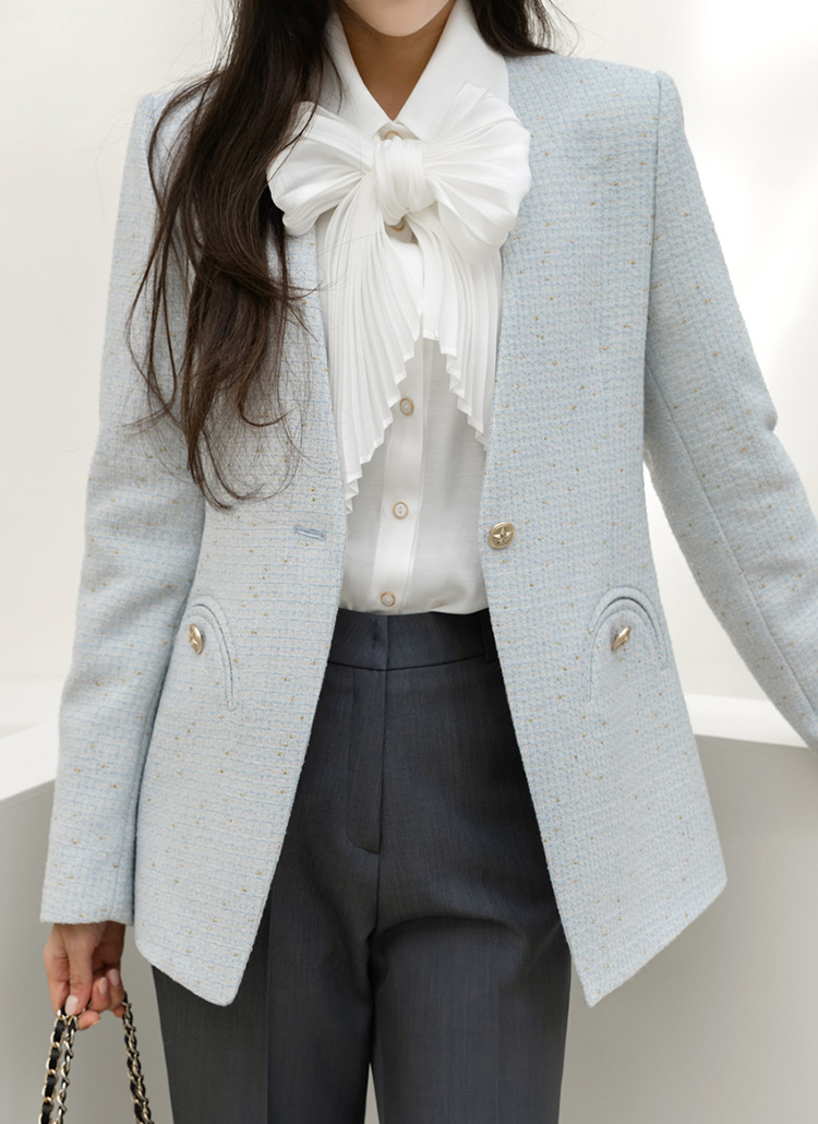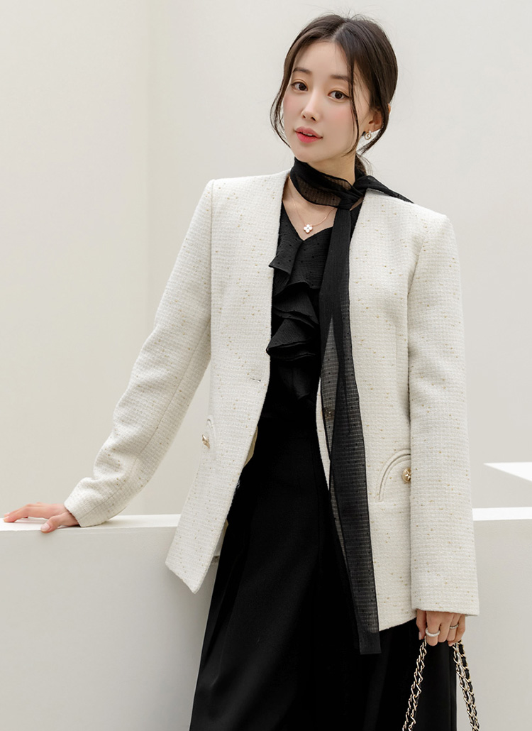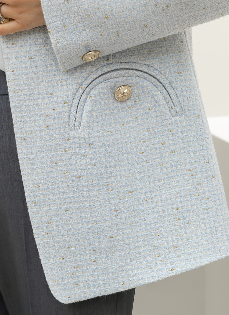 • 파비안 스타 골드 버튼 포인트 포켓 펄 트위드 노카라 미드 자켓