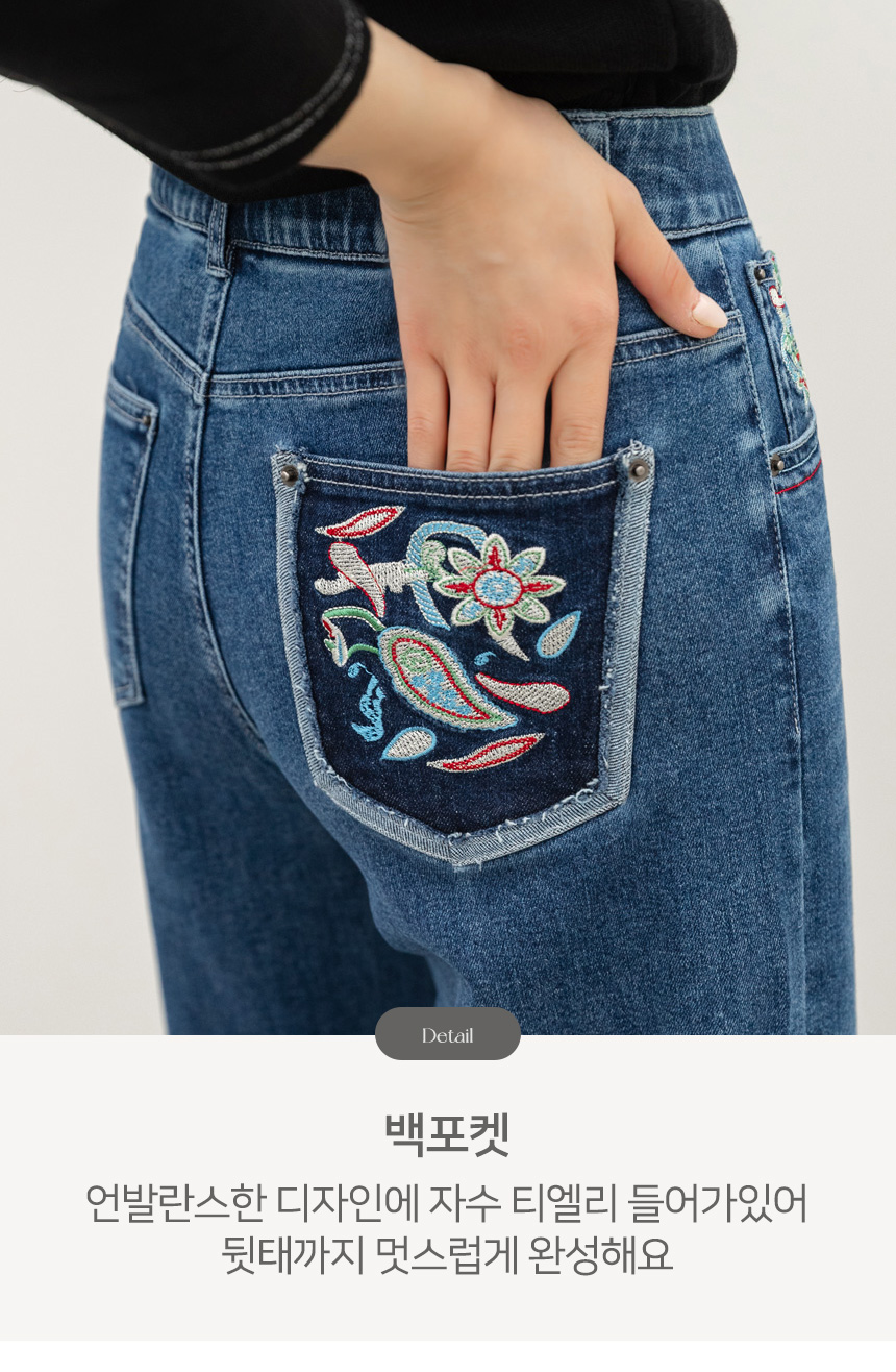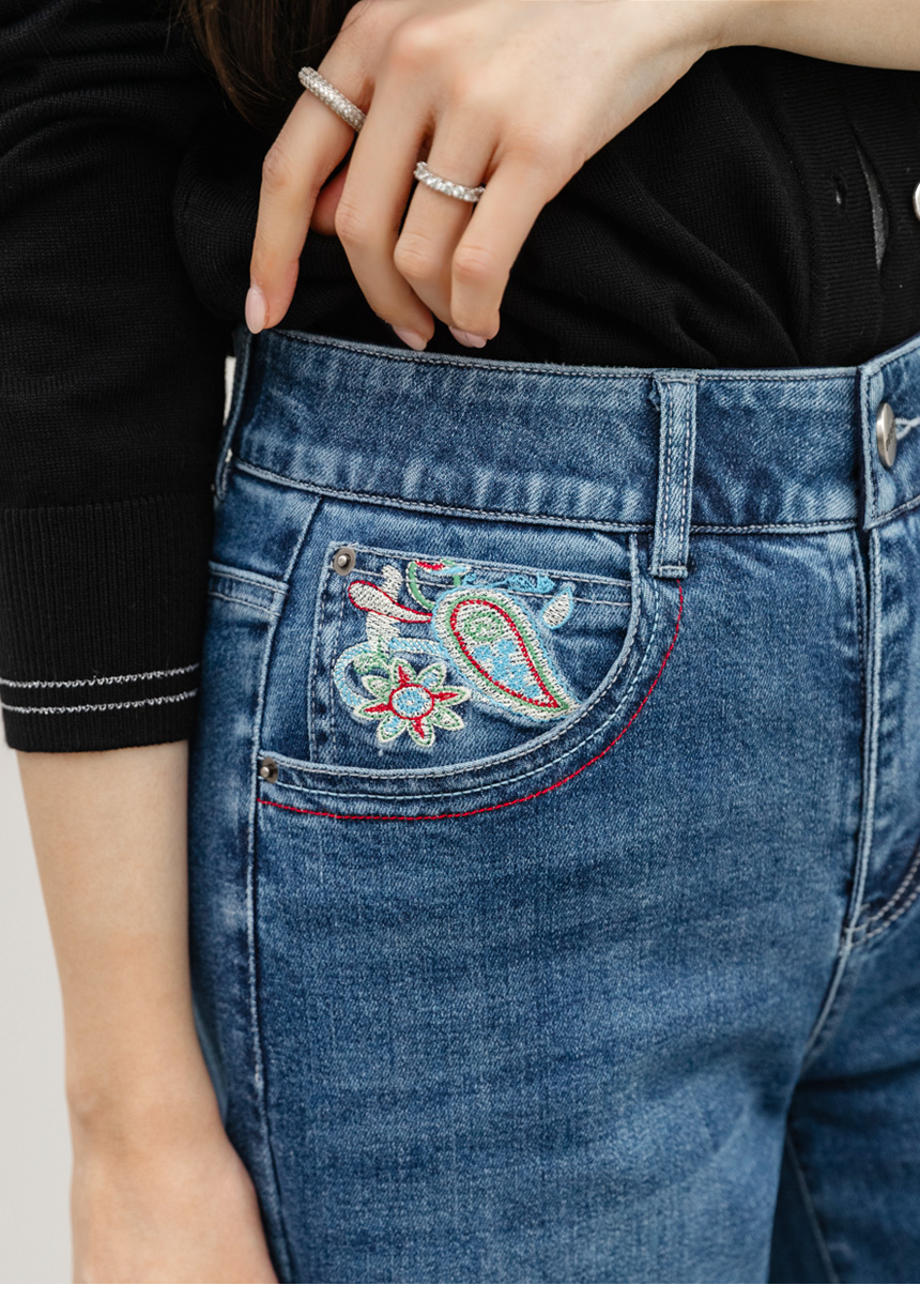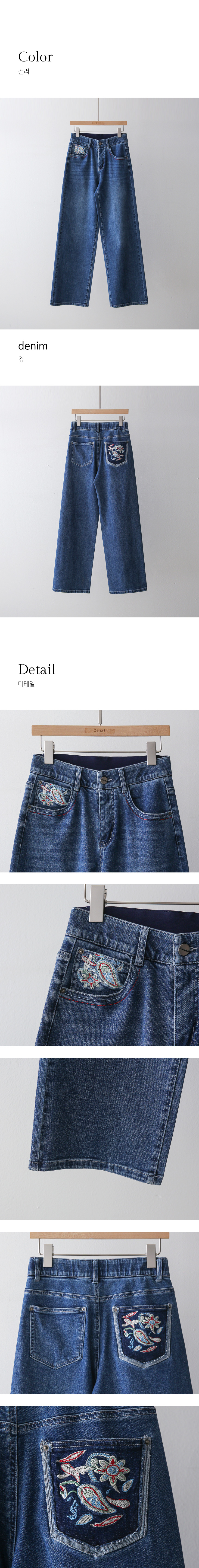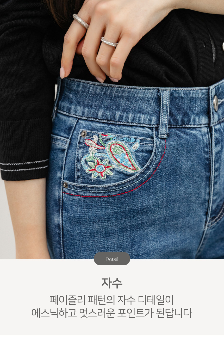 • 로어프 에스닉 페이즐리 자수 포인트 히든밴딩 세미 와이드 데님 팬츠