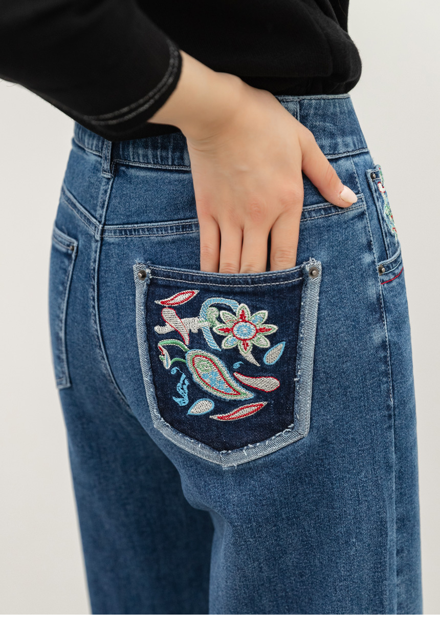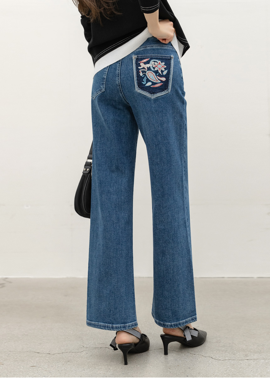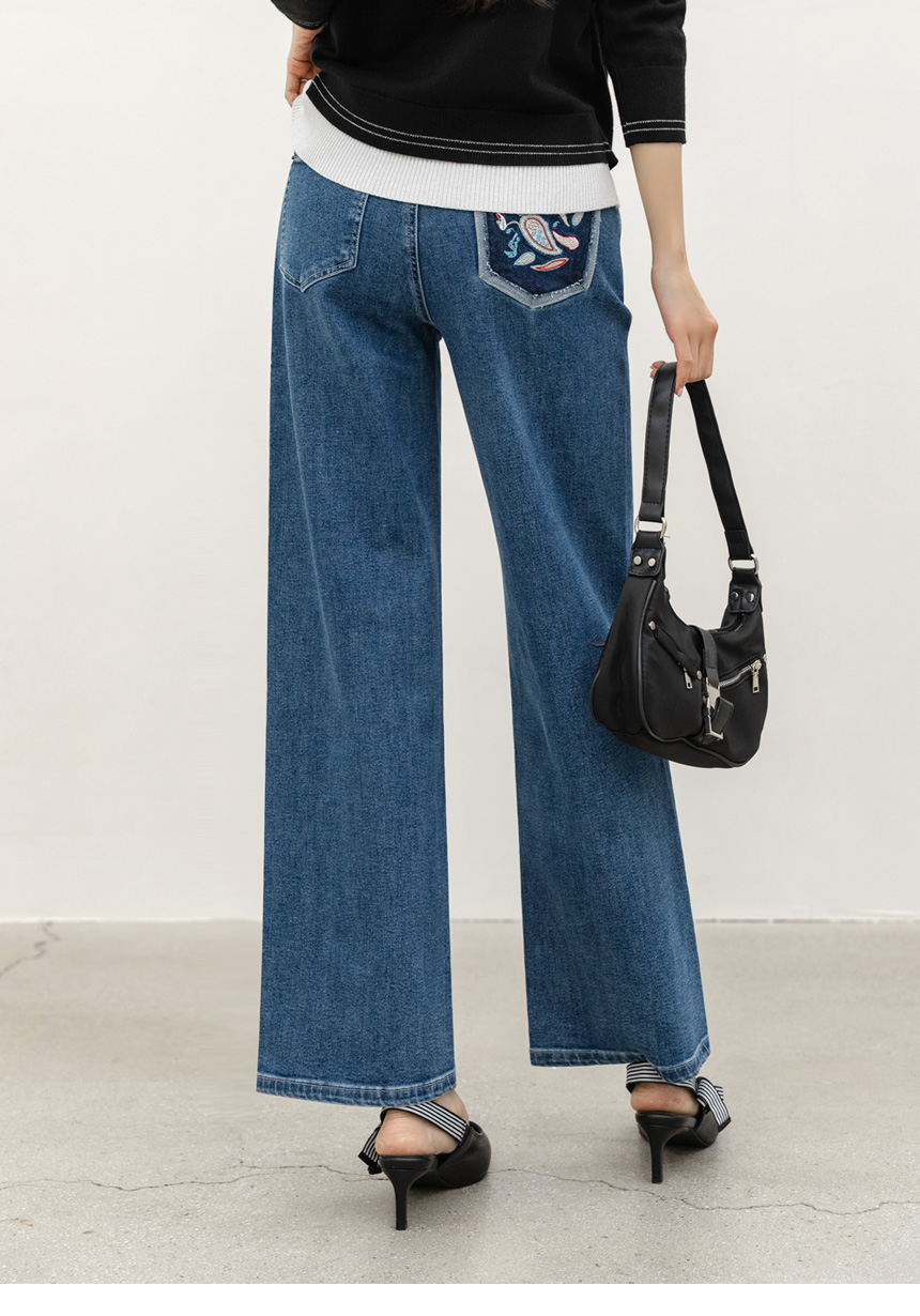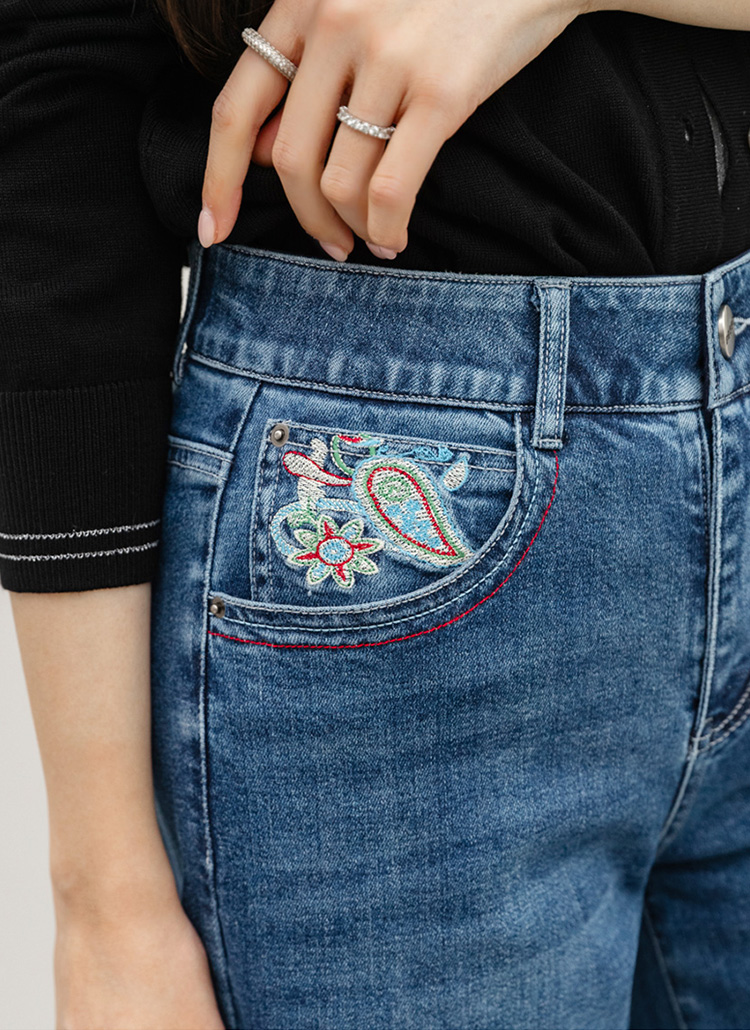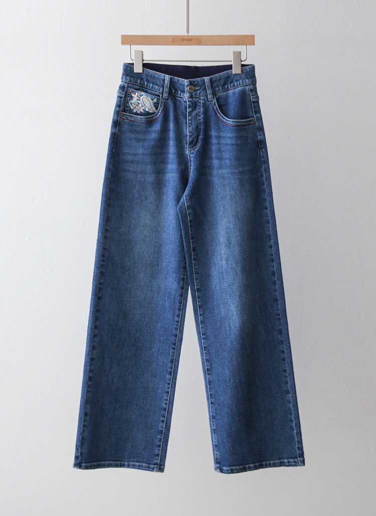 • 로어프 에스닉 페이즐리 자수 포인트 히든밴딩 세미 와이드 데님 팬츠