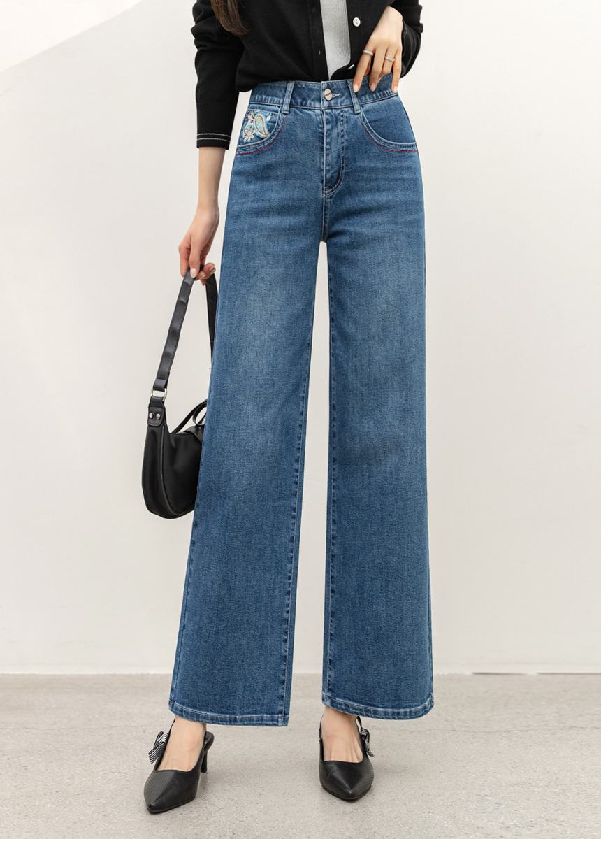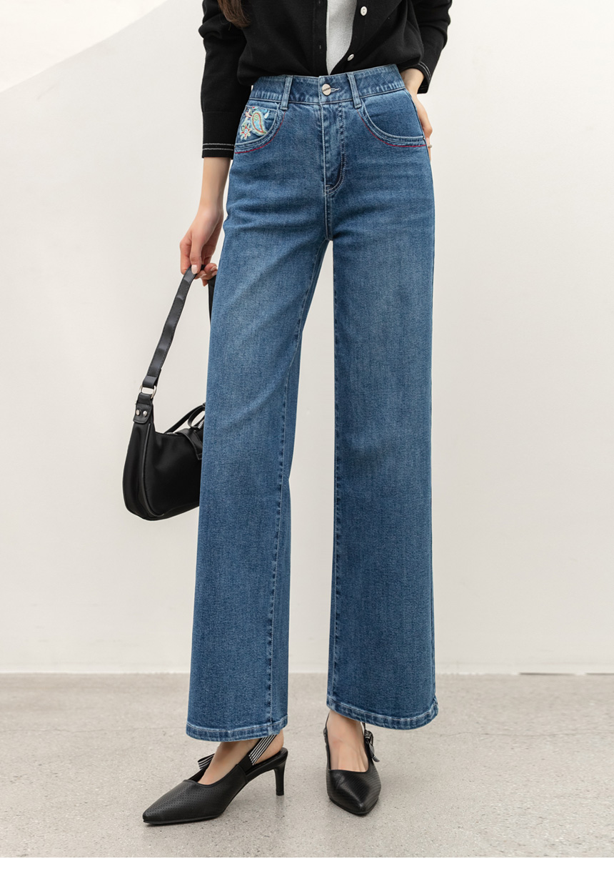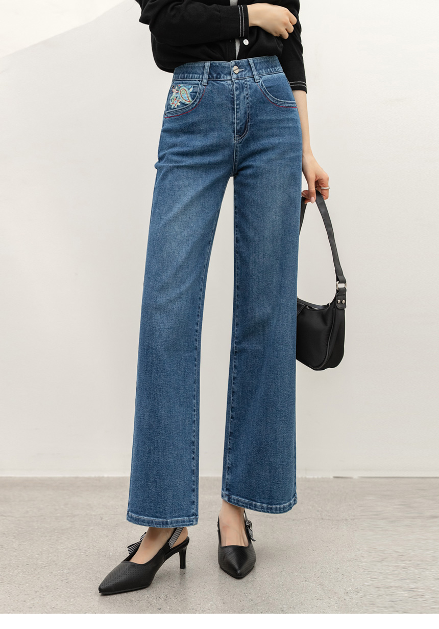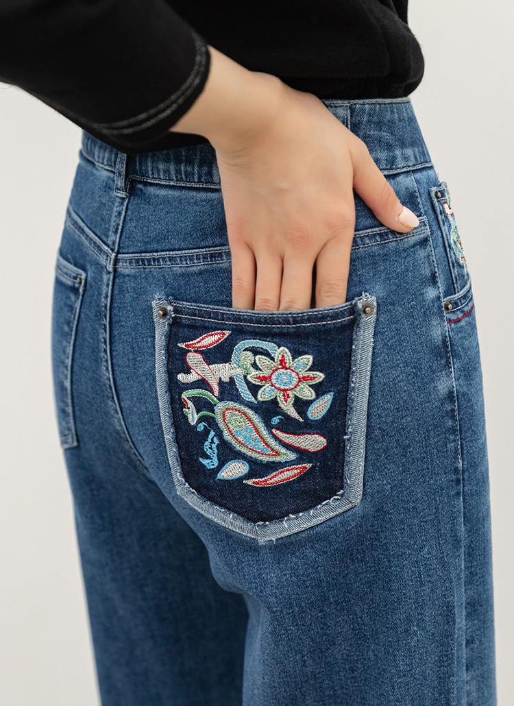 • 로어프 에스닉 페이즐리 자수 포인트 히든밴딩 세미 와이드 데님 팬츠