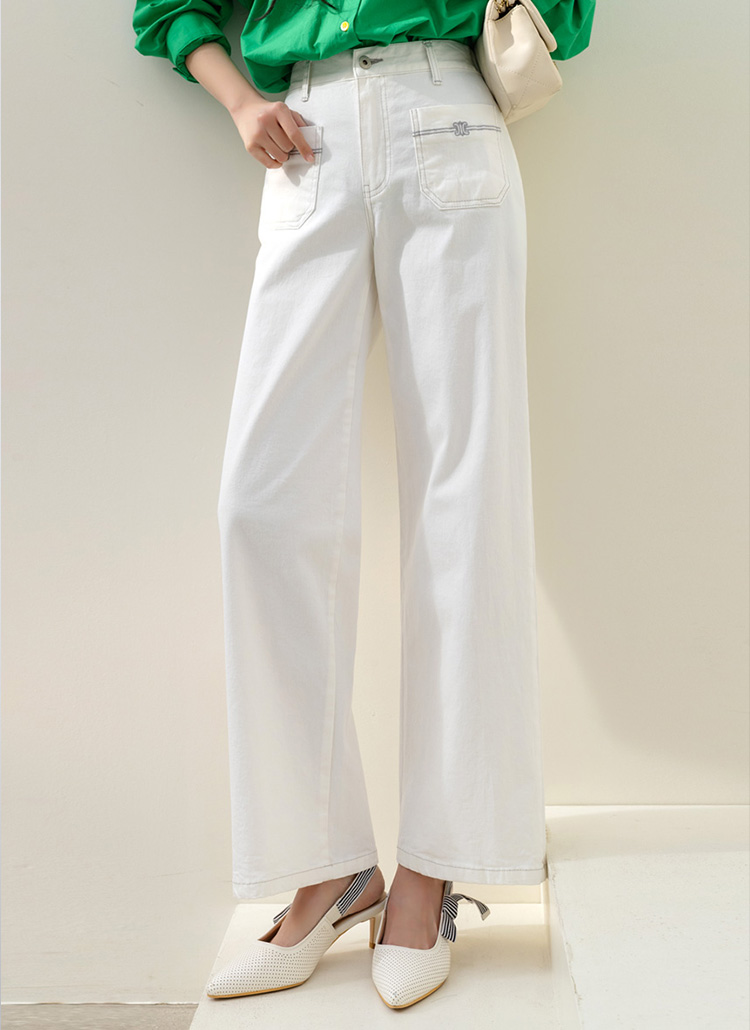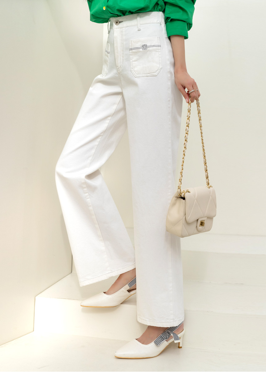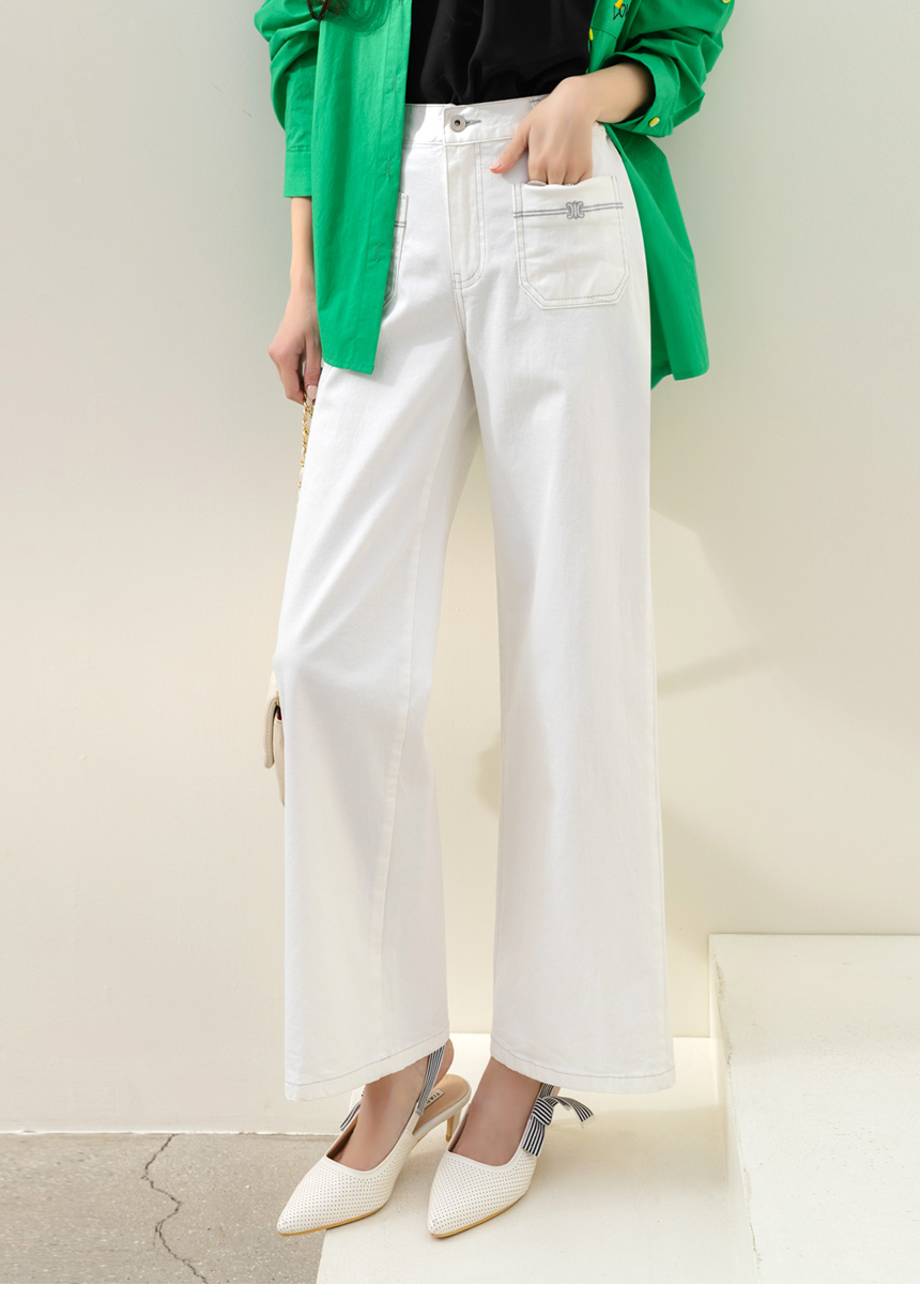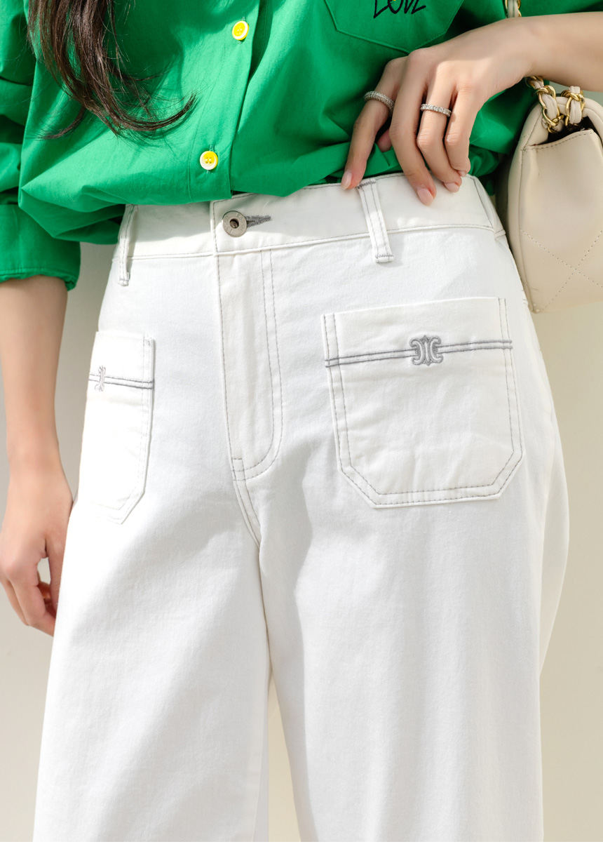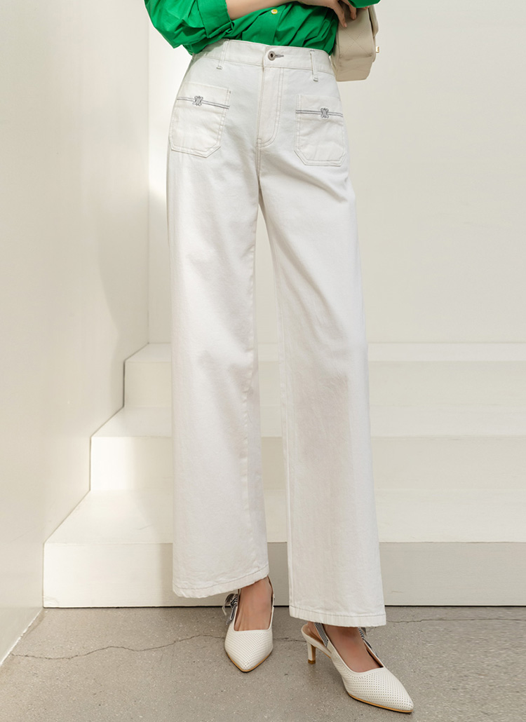 • 온디어 자수 포켓 백 밴딩 세미 와이드 일자 면 팬츠