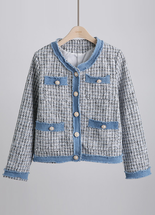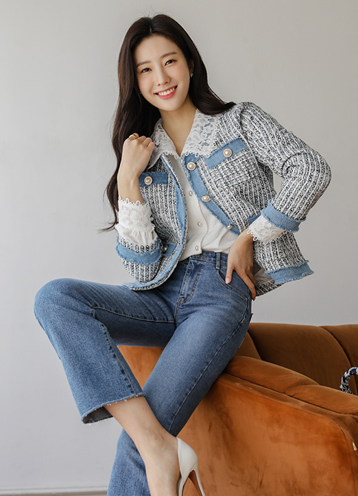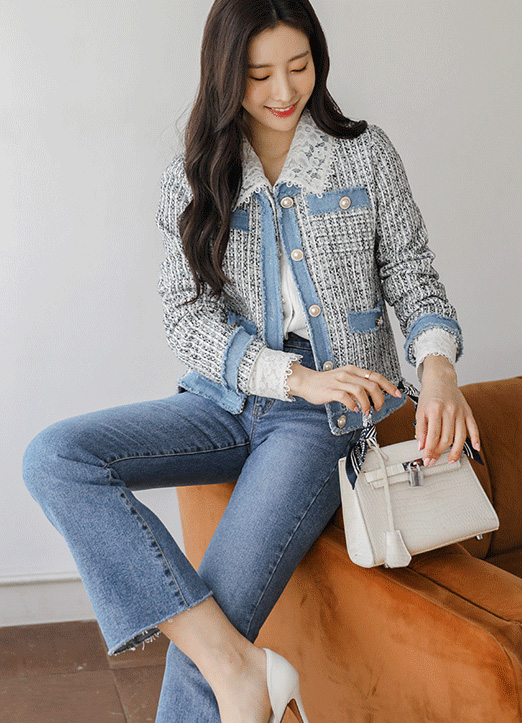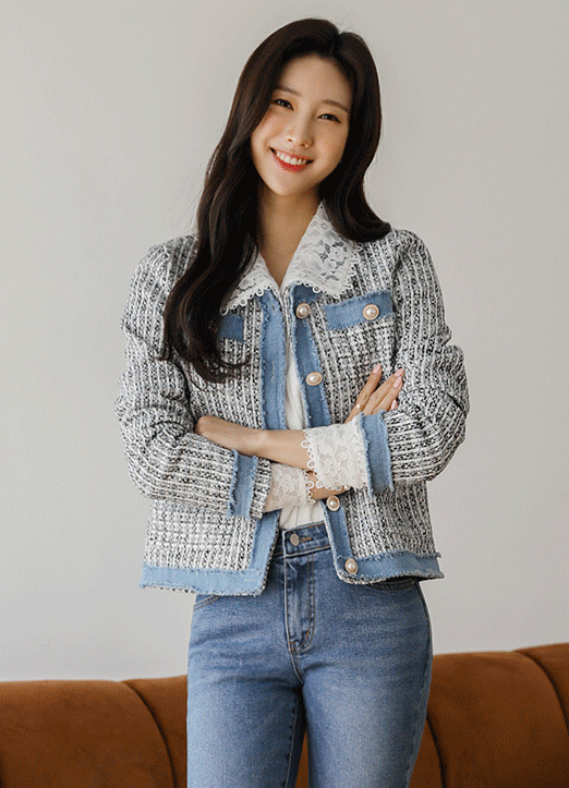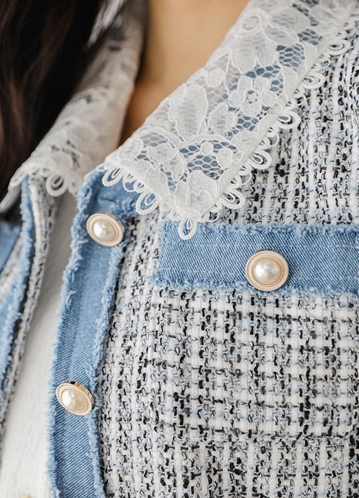 [Structured tweed jacket with chic denim accents and pearl buttons, finished in a clean collarless cut for polished everyday elegance.]