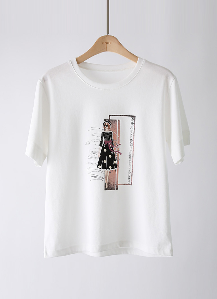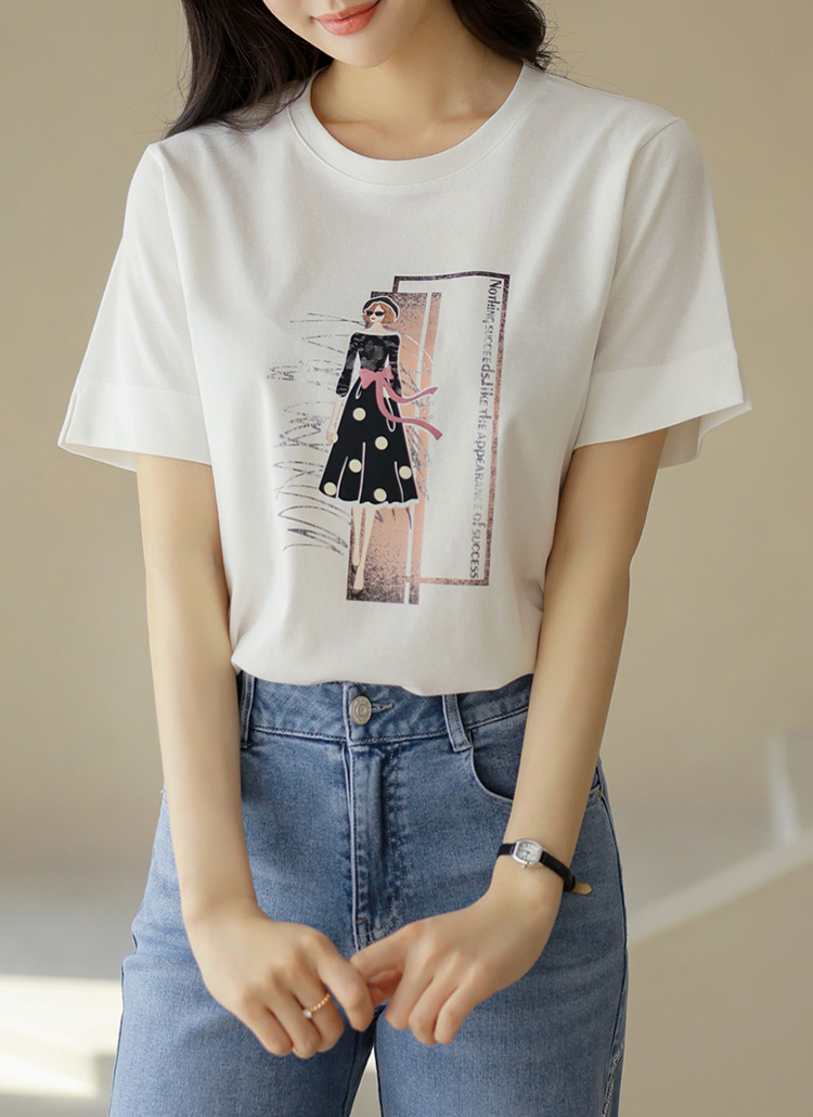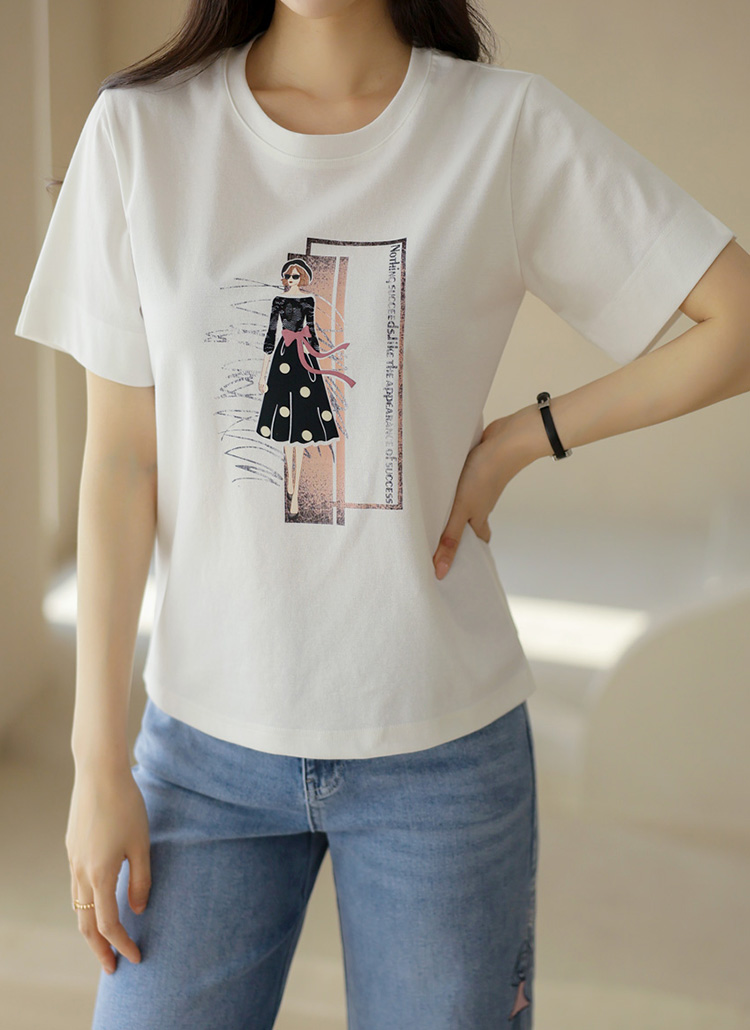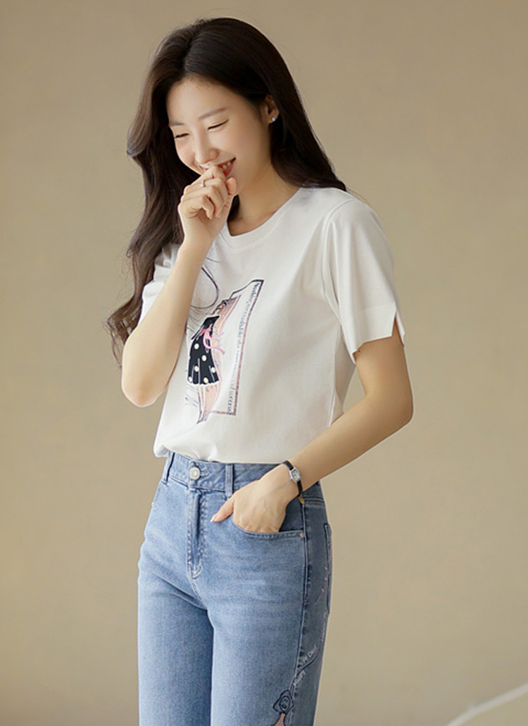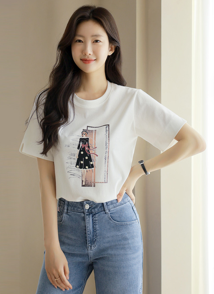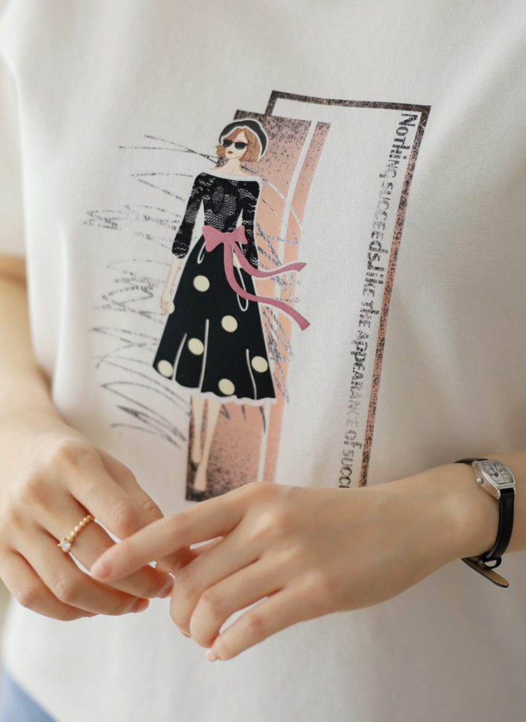 [Stylish feminine illustration adds a refined artistic touch to your look. Soft stretch fabric ensures comfort, while the relaxed fit allows easy styling for everyday casual outfits.]