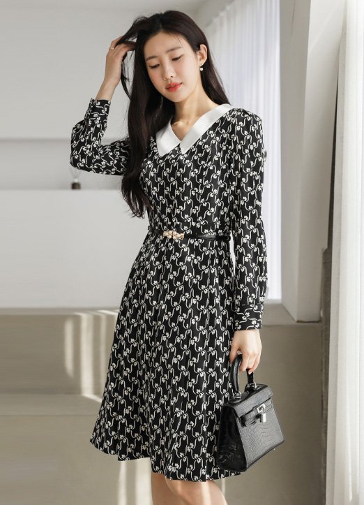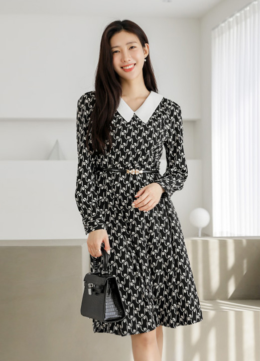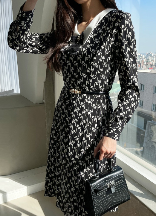 [ Classic black dress with distinctive white flower-chain pattern and sharp contrast collar. The flowing pleated skirt and tailored sleeves create a refined silhouette suitable for various occasions.]