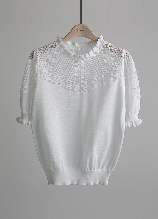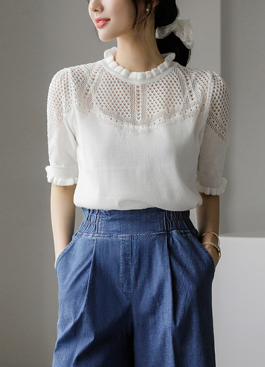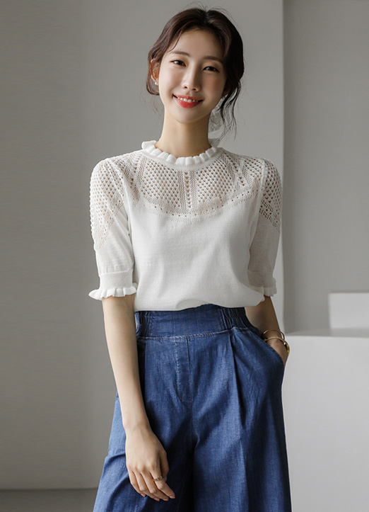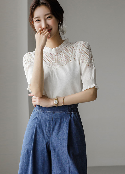 [Delicate crochet yoke and shoulders meet soft knit fabric in this summer-ready top. Features charming puff sleeves, ruffled collar and elastic hem for a flattering silhouette.]