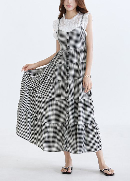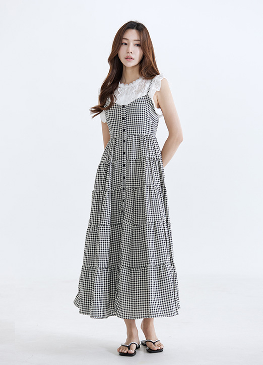 [A breezy gingham maxi dress with adjustable straps and a smocked back, offering a flattering fit and soft tiered volume for relaxed summer styling.]