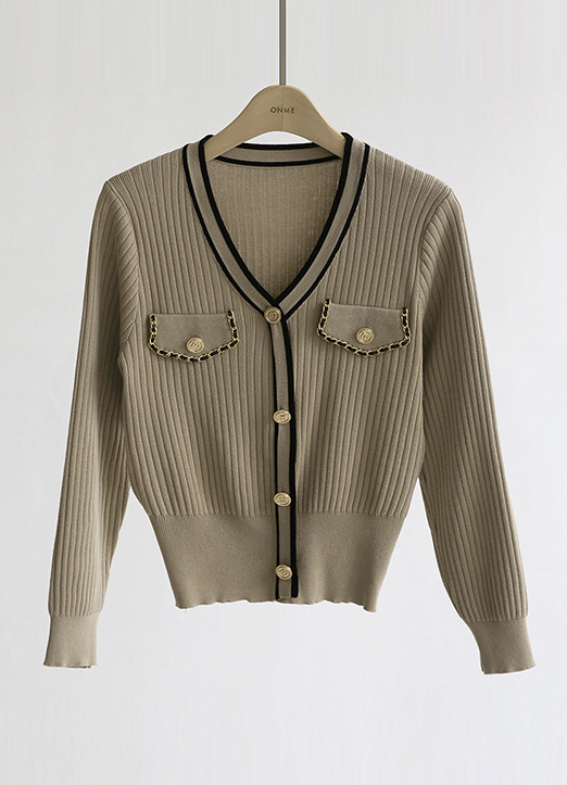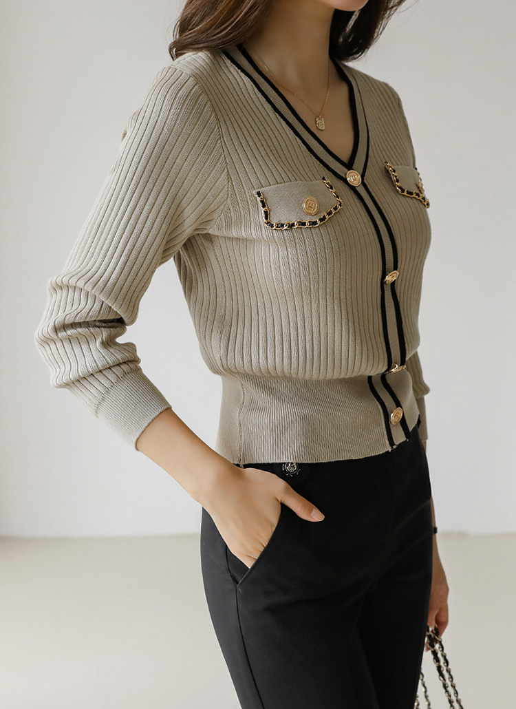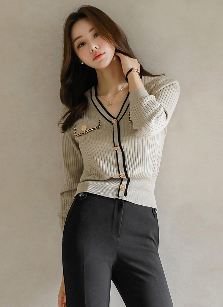 (4 Colors) Contrast Stripe Trim Cardigan Look Ribbed Knit Top