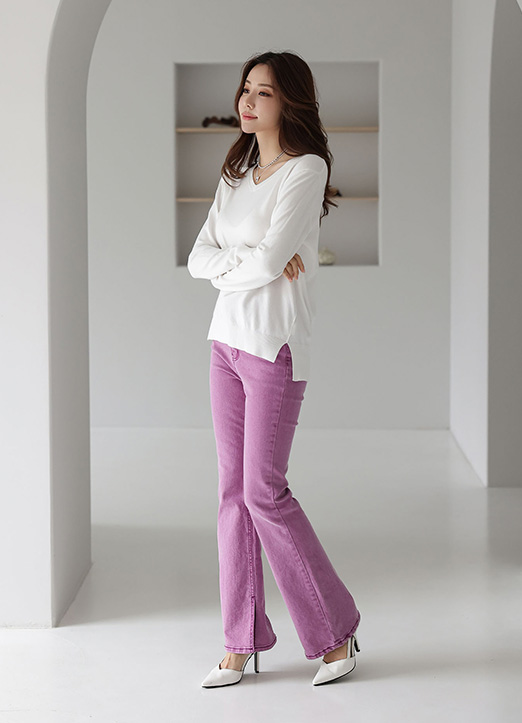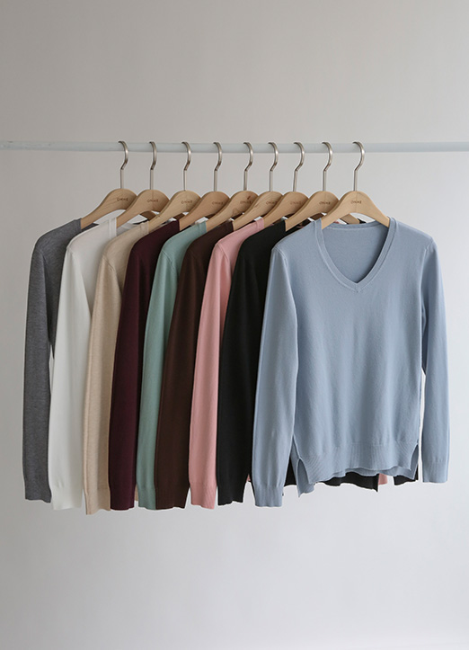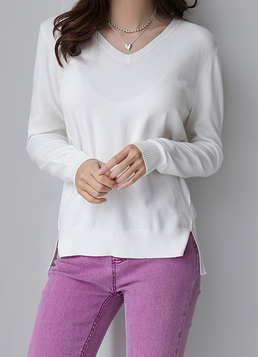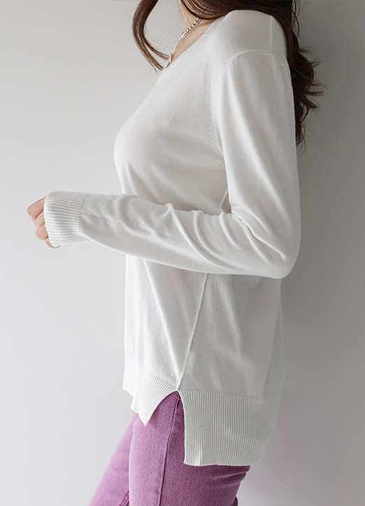 (9 Colors) V-Neck Side Slit Viscose Blend Knit Top