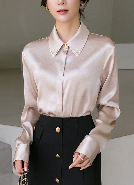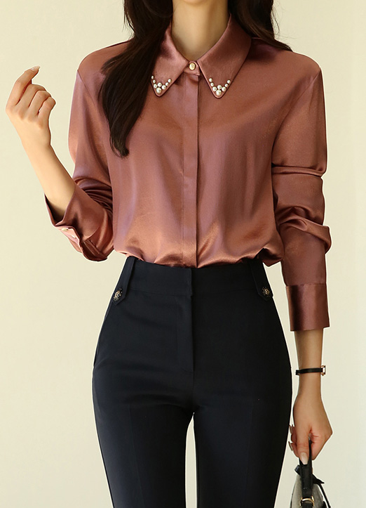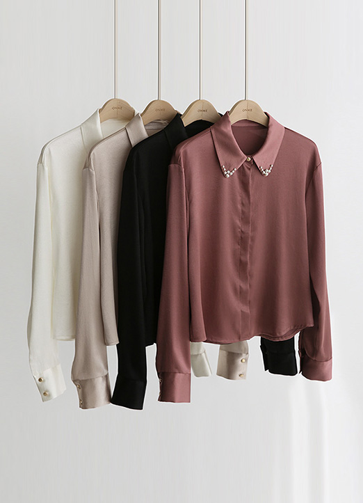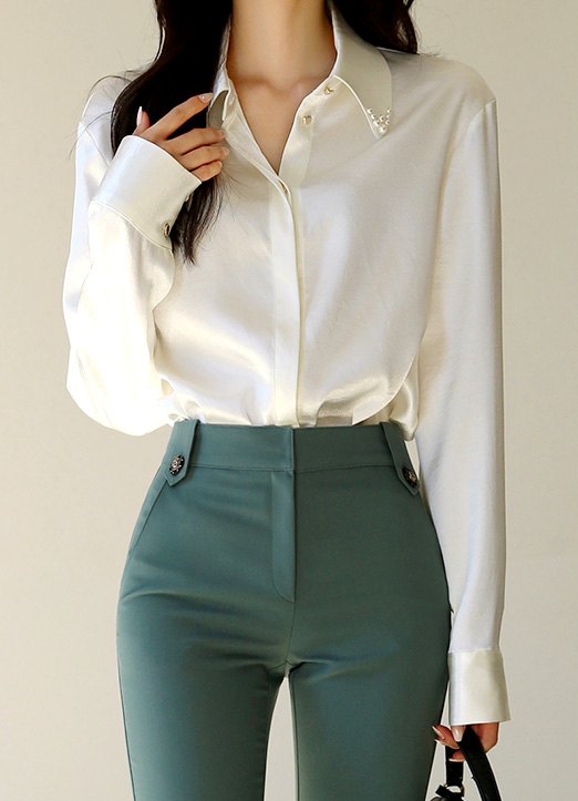 크기가 각기다른 진주 비즈로 카라의 엣지를 살려주어