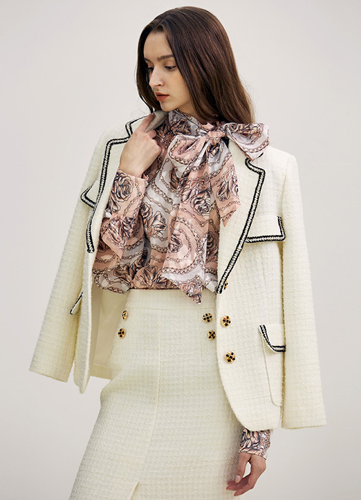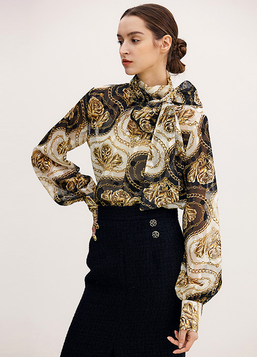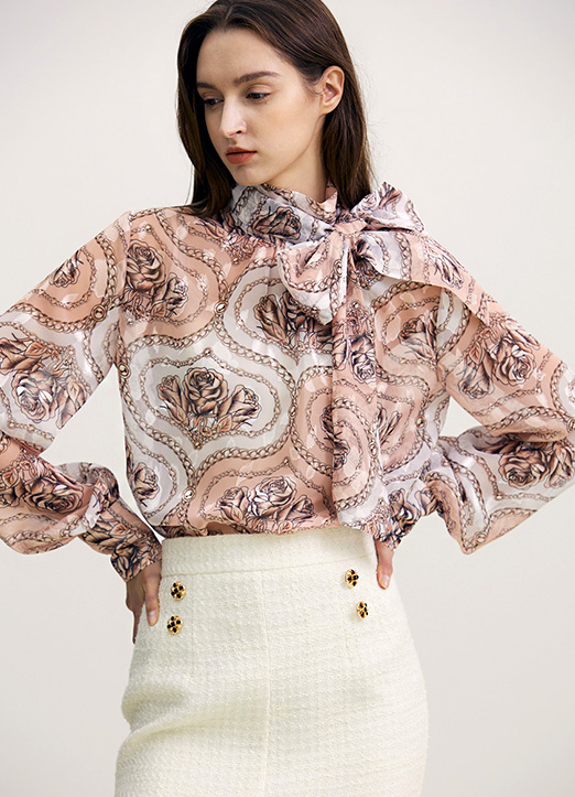 [The Onme] Rose & Chain Print Tie-Neck Jacquard Chiffon Blouse