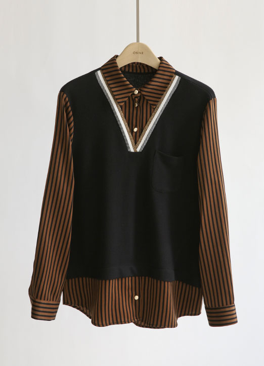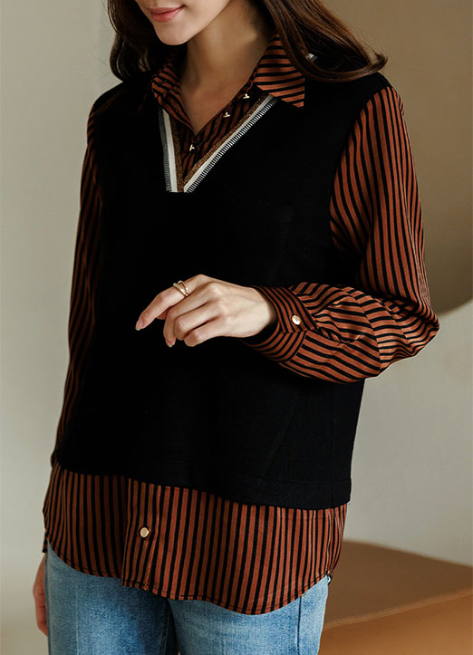 배색 스트라이프 레이어드 조끼 셔츠 블라우스에요